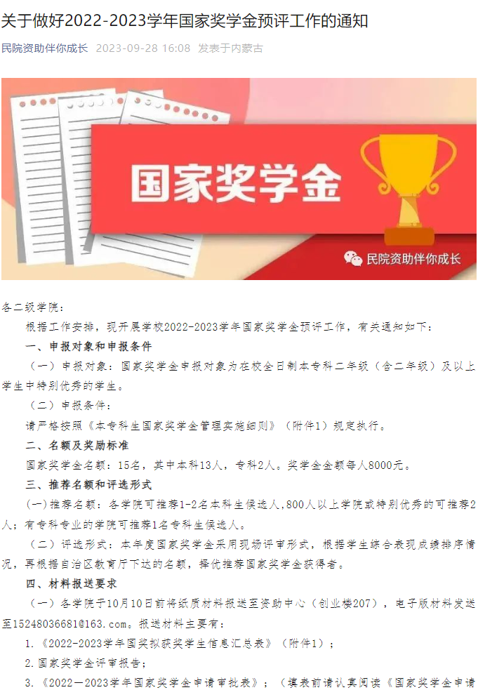 转载学校党委学生工作部(处)《关于做好2022-2023学年国家奖学金预评工作的通知》