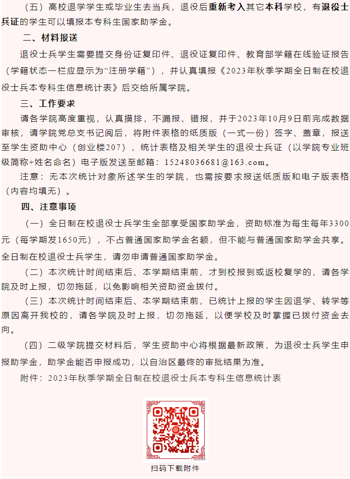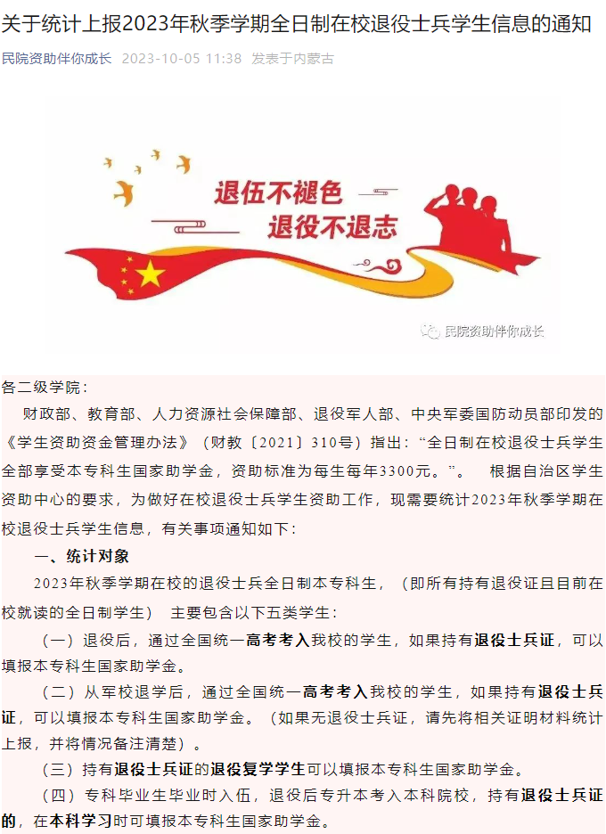 转载学校党委学生工作部(处)《关于统计上报2023年秋季学期全日制在校退役士兵学生信息的通知》