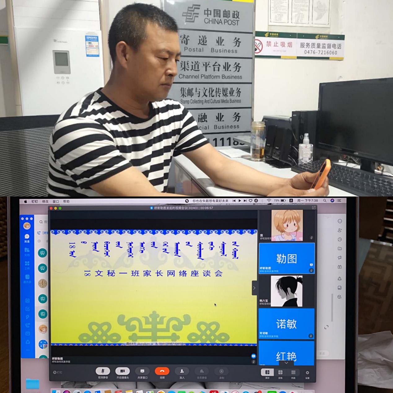呼斯勒图老师就目前学校和学院的相关安排进行了情况说明,向家长详细介绍了两个班级的基本情况和线上上课情况,就学校防控疫情情况和学校推行的健康E站打卡工作情况进行了解释并强调了其重要意义。呼斯勒图老师向家长传达了学院的线上教学开课情况的通知要求和本班学生线上学习登录情况,要求家长关注学生线上学习情况,经常督促学生上课纪律。第三,呼斯勒图老师向家长介绍了学院学生工作的开展情况和后期教学活动安排,表达了多与家长沟通、深入了解学生情况的意愿和为学生提公共更好服务的意愿。最后,家长对关心的问题与班主任进行了交流,呼斯乐图老师对家长最为关心的返校复学相关事宜上做了详细的解答。