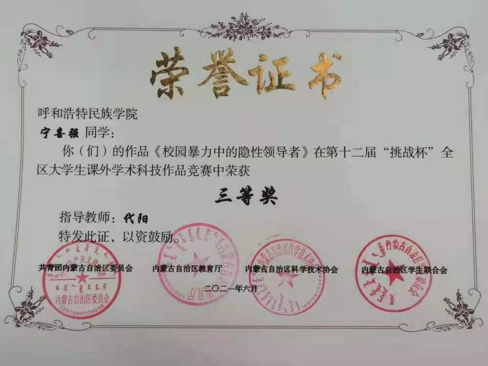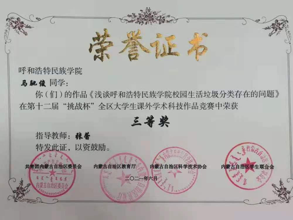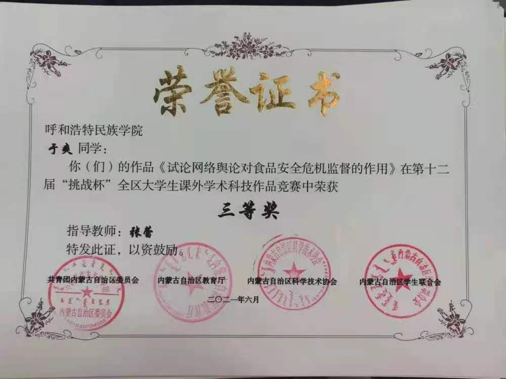 由共青团内蒙古自治区委员会、内蒙古自治区教育厅、内蒙古自治区科学技术协会和内蒙古自治区学生联合会主办的第十二届“挑战杯”全区大学生课外学术科技作品竞赛中我院学生喜获佳绩。学院教工党支部深入贯彻落实党史学习教育部署要求,党员教师亮出身份、履行职责,为学生们提供竞赛指导,筑梦成长。在张蕾老师和代阳老师的精心指导下,我院于爽同学的参赛论文《试论网络舆论对食品安全危机监督的作用》、马驰俊同学的参赛论文《浅谈Beat365唯一官方网站学生校园生活垃圾分类存在的问题》和宁喜强同学的参赛论文《校园暴力中的隐性领导者》在本次比赛中分别荣获“三等奖”。