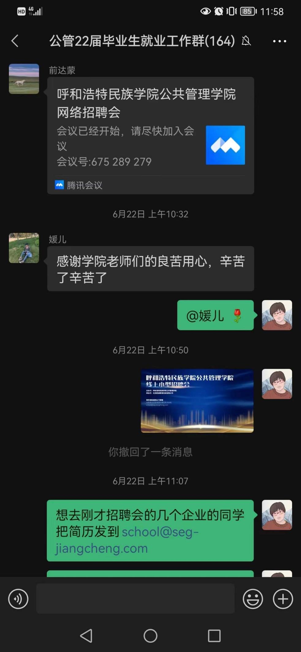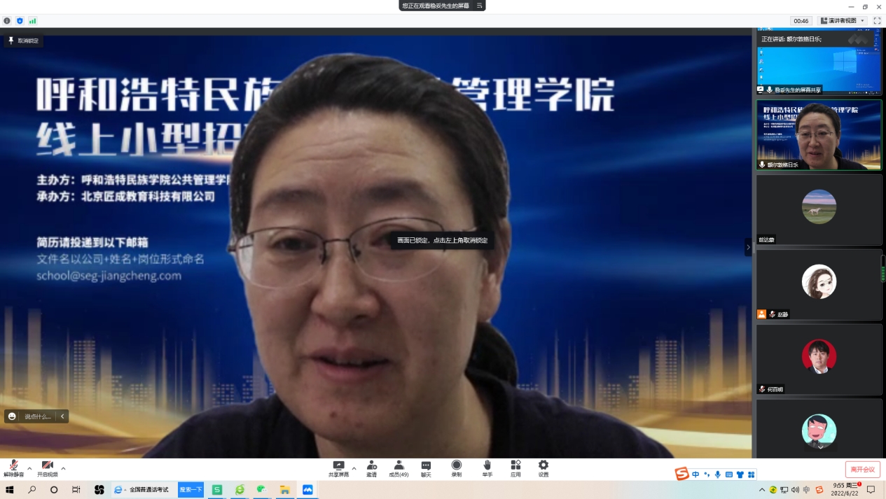 按照教育部《高校书记校长访企拓岗促就业专项行动》和学校党委推进就业工作的相关要求,为深入贯彻落实就业优先战略,推进校企深度融合发展,全力促进我院毕业生更加充分、更高质量就业,切实满足我院广大毕业生的求职需求,公共管理学院携手北京匠成教育科技有限公司于2022年6月22日举办了2022届毕业生企业宣讲招聘会。会议由党总支副书记额尔敦格日勒主持。