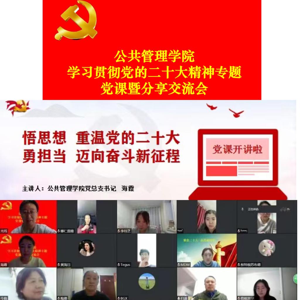 为深入学习贯彻党的二十大精神,12月16日,公共管理学院党总支开展了学习贯彻党的二十大精神专题党课暨交流分享会。全院教师和学生党员参加了会议。