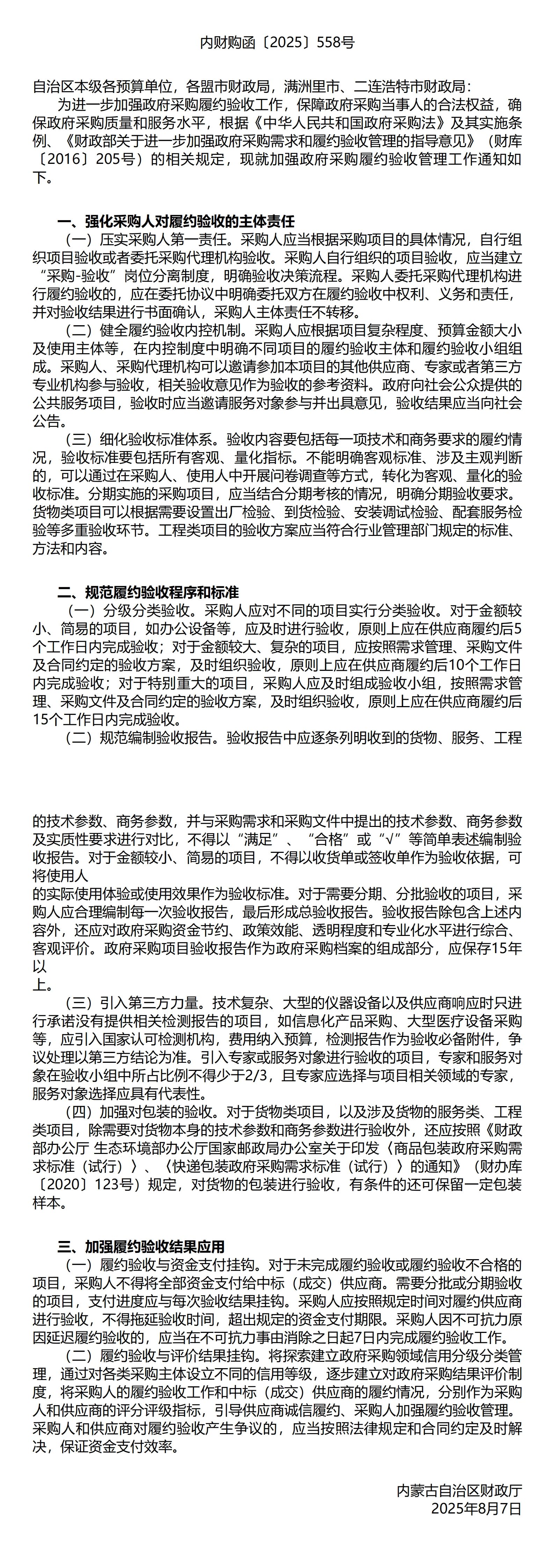 内蒙古自治区财政厅关于加强政府采购履约验收工作的通知