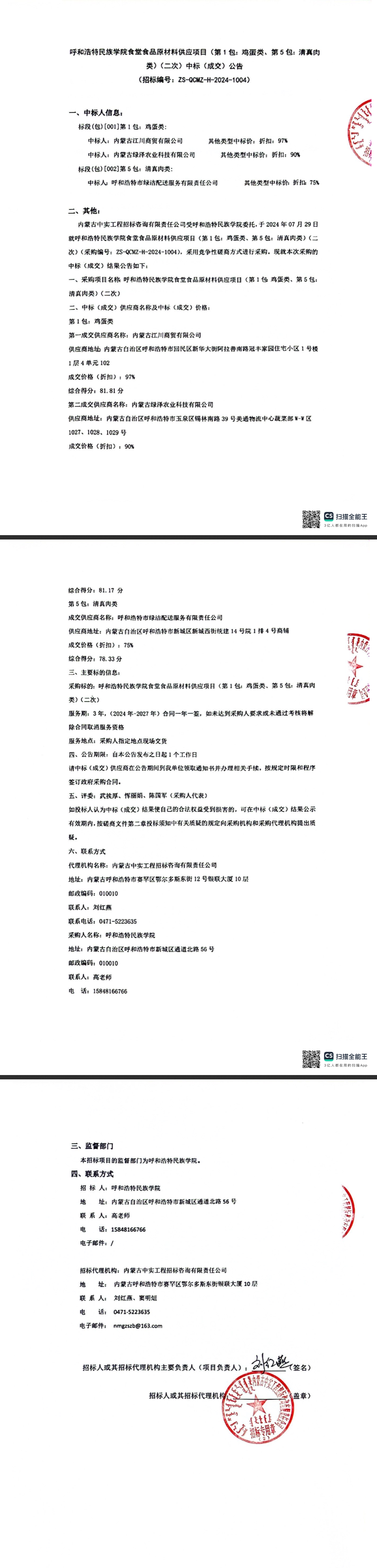 Beat365唯一官方网站食堂食品原材料供应项目(第1包:鸡蛋类、第5包:清真肉类)(二次)中标(成交)公告