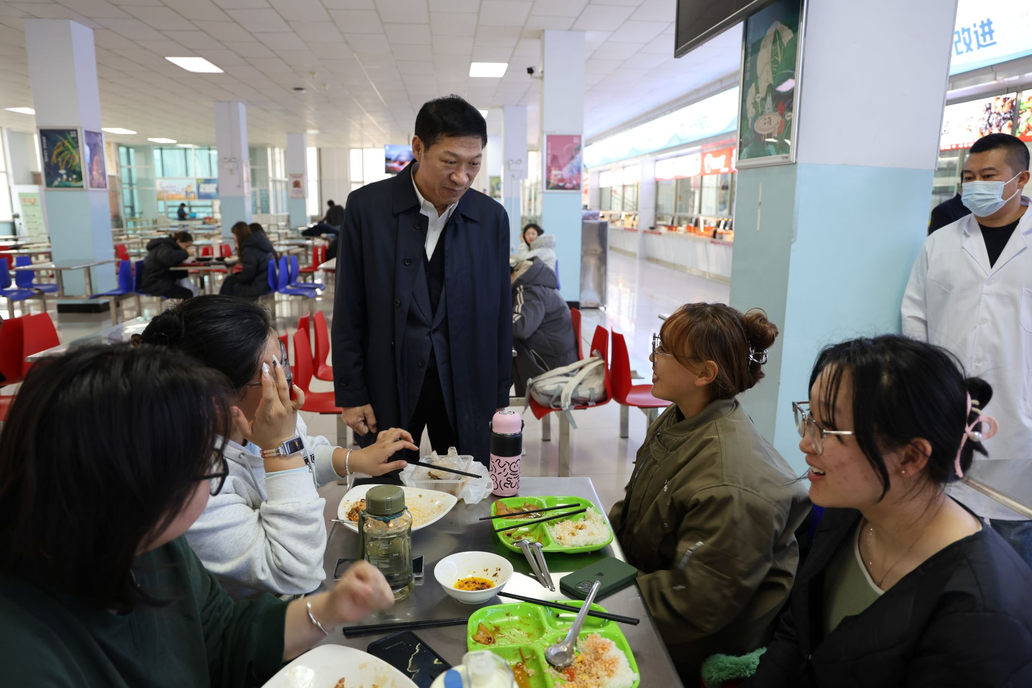 在北区食堂,刘九万与正在就餐的同学们亲切交谈,询问大家的生活和学习情况,了解同学们的心声,听取学生的意见和建议。同学们畅所欲言,表示食堂的品种更多了、环境更好了、价格更实在了。
