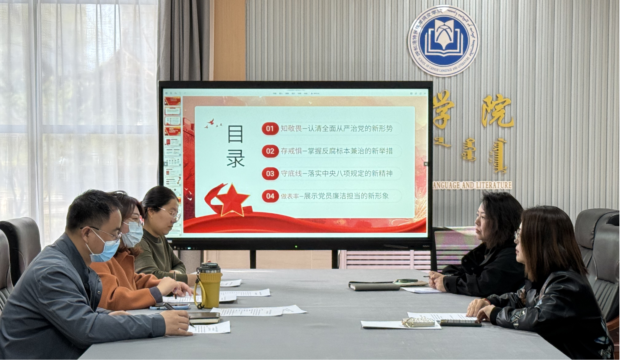 为深入贯彻中央八项规定精神学习教育,强化作风建设,2025年4月24日下午,文学院党总支副书记包冬梅讲授专题党课。文学院党总支委员参加党课学习。