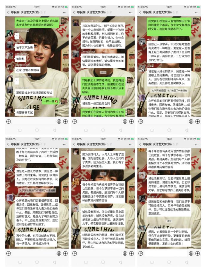 为贯彻落实学校《关于举办2020年“资助育人文化节”的通知》(呼和民院学字[2020]29号)的文件精神,文学院于6月18日-6月28日期间组织各班级利用钉钉平台召开“资助-感恩-诚信”系列主题班会。会上,同学们表达了对国家、学校给予资助的感恩之情,共同探讨了诚信考试的重要性,表达了要端正态度,认真严肃对待考试的决心。