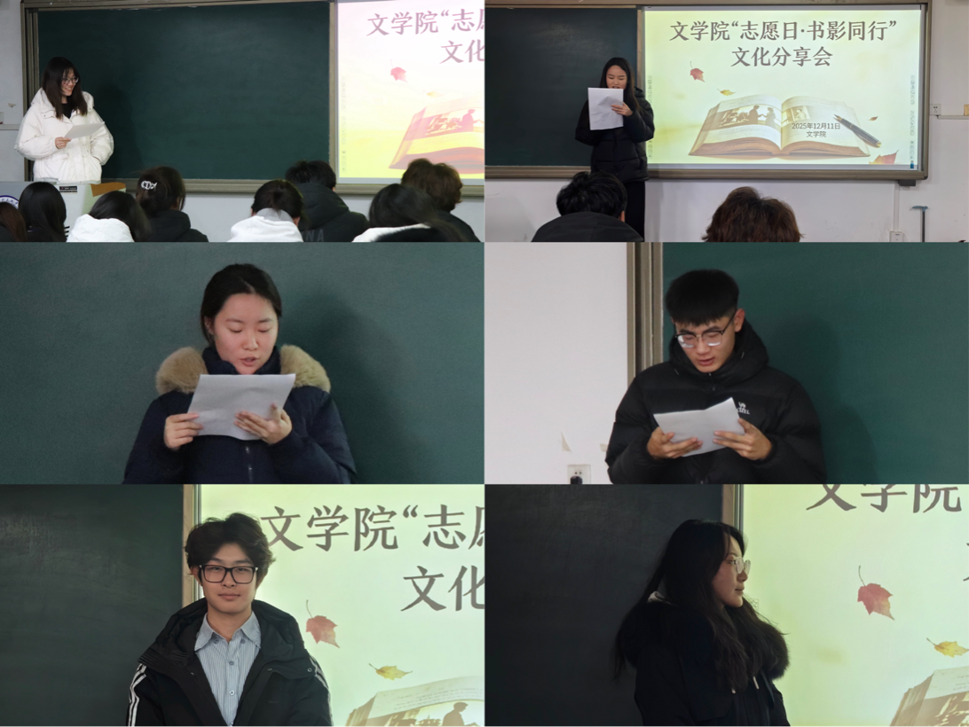 为深入学习贯彻党的二十届四中全会精神,厚植青年学生感恩党、听党话、跟党走的坚定信念,以文化赋能志愿服务高质量发展,12月16日,文学院全体学生干部共计40余人于 尚智楼225教室开展“志愿日,书影同行”文化分享会,以书影为媒搭建交流平台,凝聚青年学子践行民生使命的青春力量。