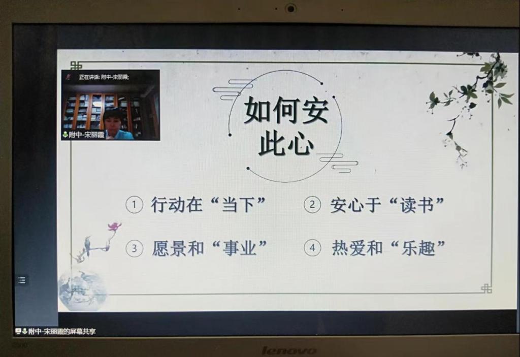 宋丽霞老师是全国语文学习学会会员、内蒙古语文学习学会理事、内蒙古师范大学教育硕士专业学位研究生导师、内蒙古师大附中“名师工程”学科带头人。讲座中,宋丽霞老师引经据典,从当下、读书、事业、乐趣四个维度给学生们进行辩证讲解,生动阐释了行动在“当下”,安心于“读书”,愿景和“事业”,热爱和“乐趣”如何完美统一在学习生活和事业发展中。“眼睛仰望天空,但必须脚踏实地。无论有多少计划,无论有多少梦想,请开始行动!”宋丽霞老师勉励学生们学会热爱,学会读书,学会感恩,行动在“当下”,努力读书学习,给自己的人生最大的收获。