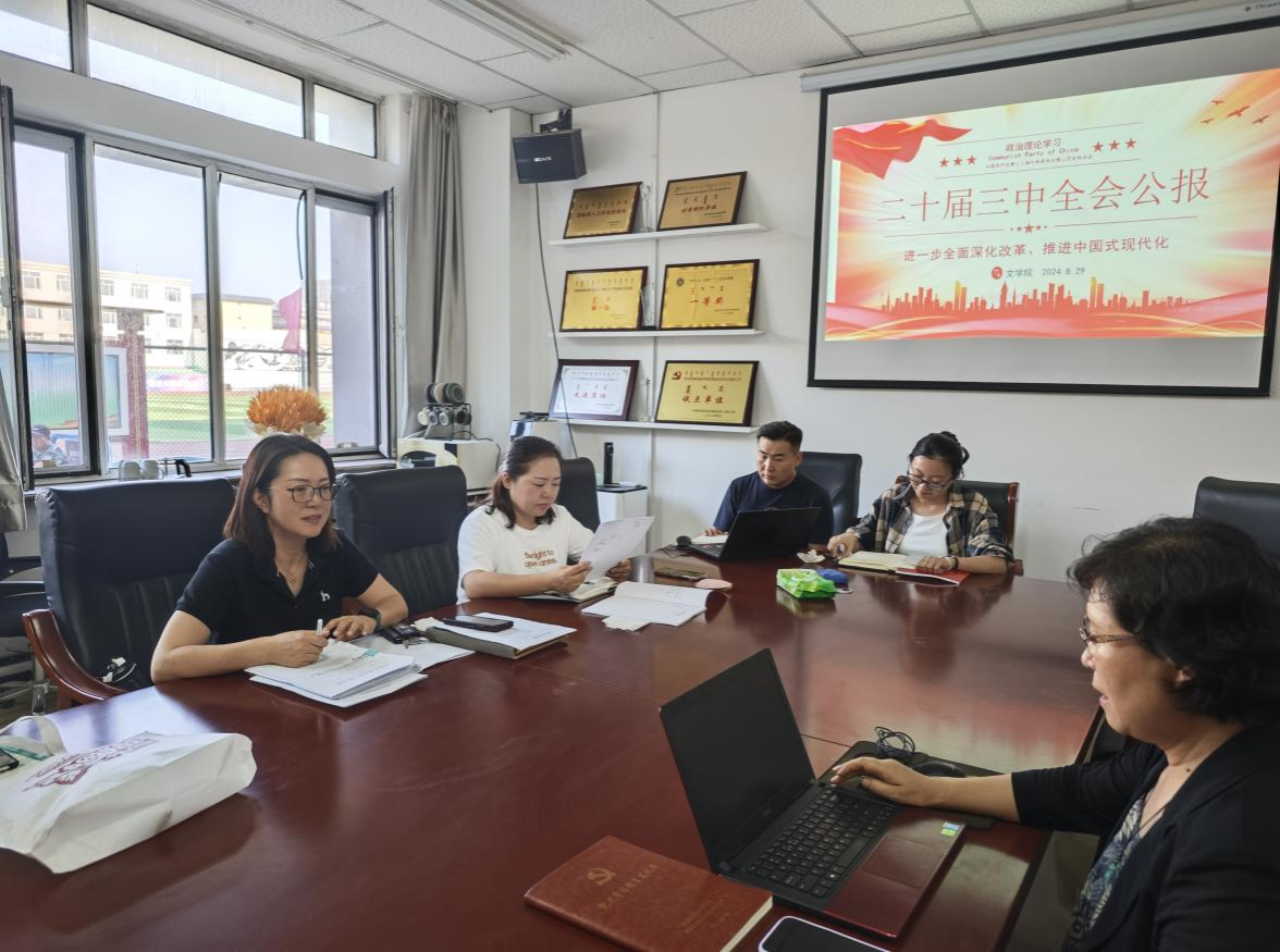 8月29日下午,文学院在会议室召开党的二十届三中全会公报专题学习会。学习会由文学院党总支书记包冬梅主持,全体教师参加会议。