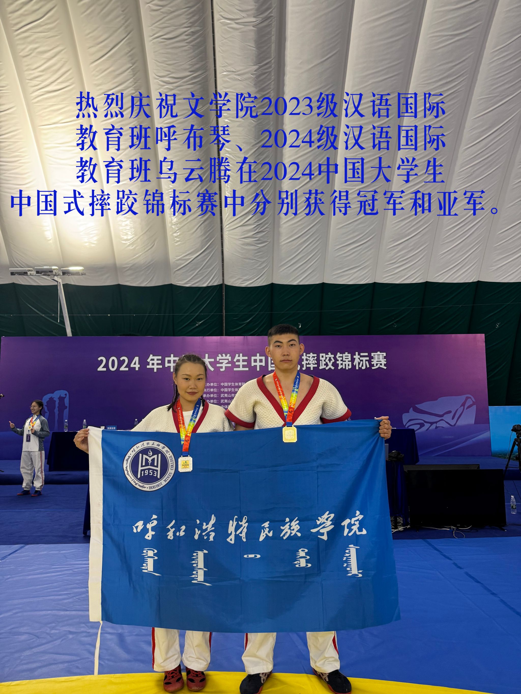 热烈庆祝文学院2023级汉语国际教育班呼布琴、2024级汉语国际教育班乌云腾在2024中国大学生中国式摔跤锦标赛中分别获得冠军和亚军