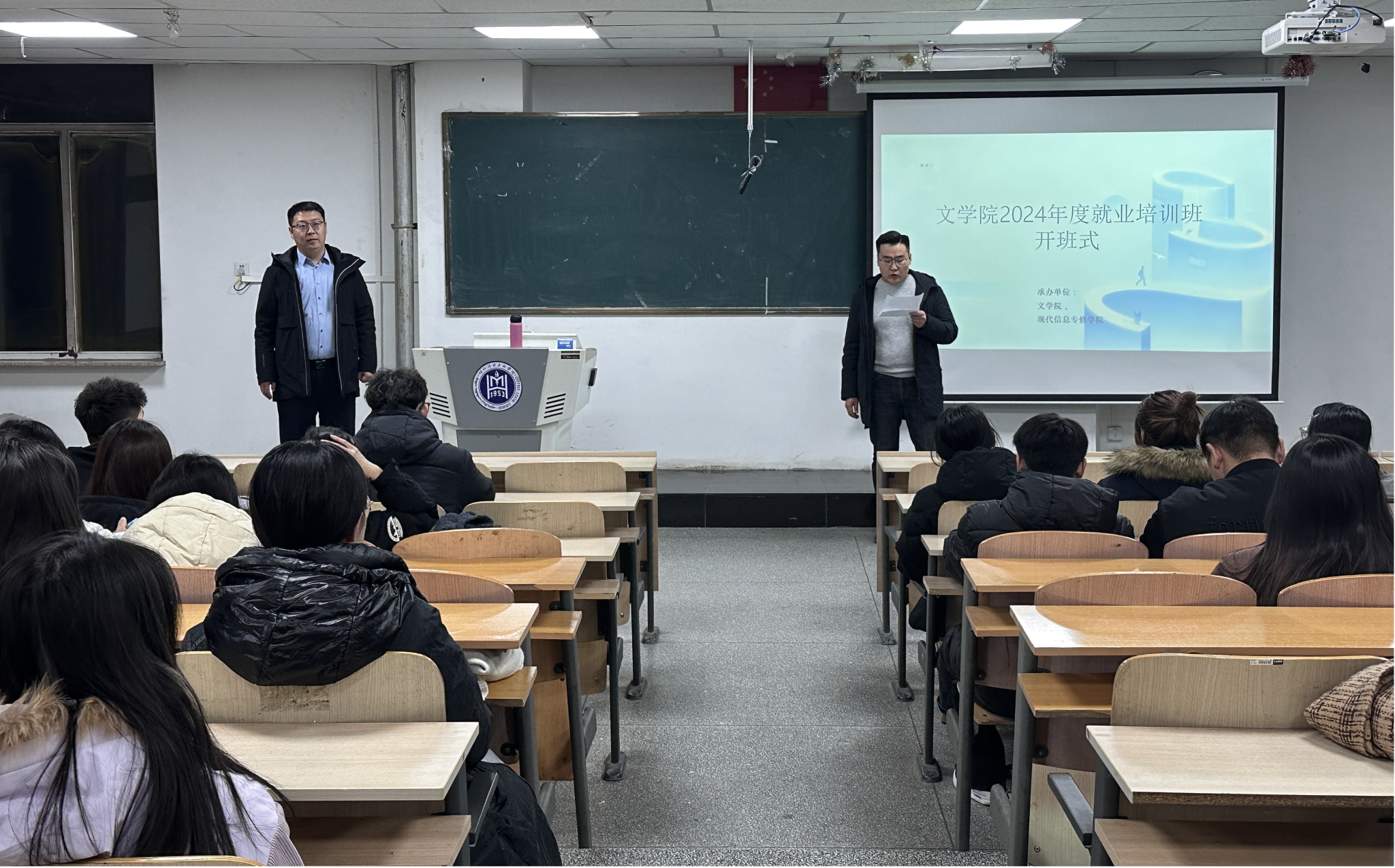 在11 月 26 日,文学院2024年度就业培训周在热烈的氛围中拉开帷幕并举行开班式。学院院长高娃,党总支副书记包冬梅,辅导员宝力尔出席开班式并讲话,文学院2021级、2022级学生近200人参加培训。