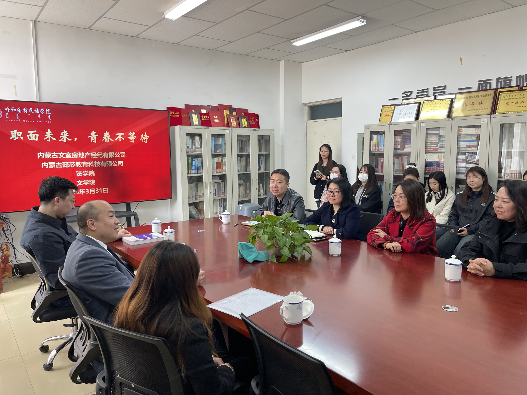 为精准对接用人单位需求,切实提升毕业生就业质量,3月31日上午,文学院与法学院在尚智楼一楼联合举办校园招聘会。文学院院长高娃、党总支副书记包冬梅,法学院党总支书记乌兰其其格、副书记姜鹏现场指导,2家用人单位代表与20余名毕业生现场互动。