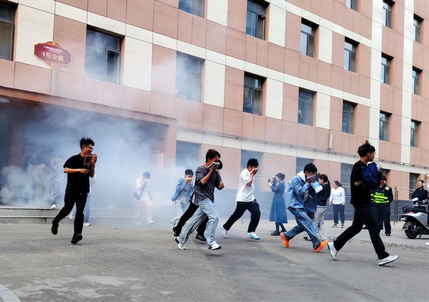 随着消防警报声响起,演练正式启动。同学们迅速进入应急状态,严格按照1号楼、2号楼预定疏散路线,用湿毛巾捂住口鼻,低姿弯腰快速有序撤离至户外空地。