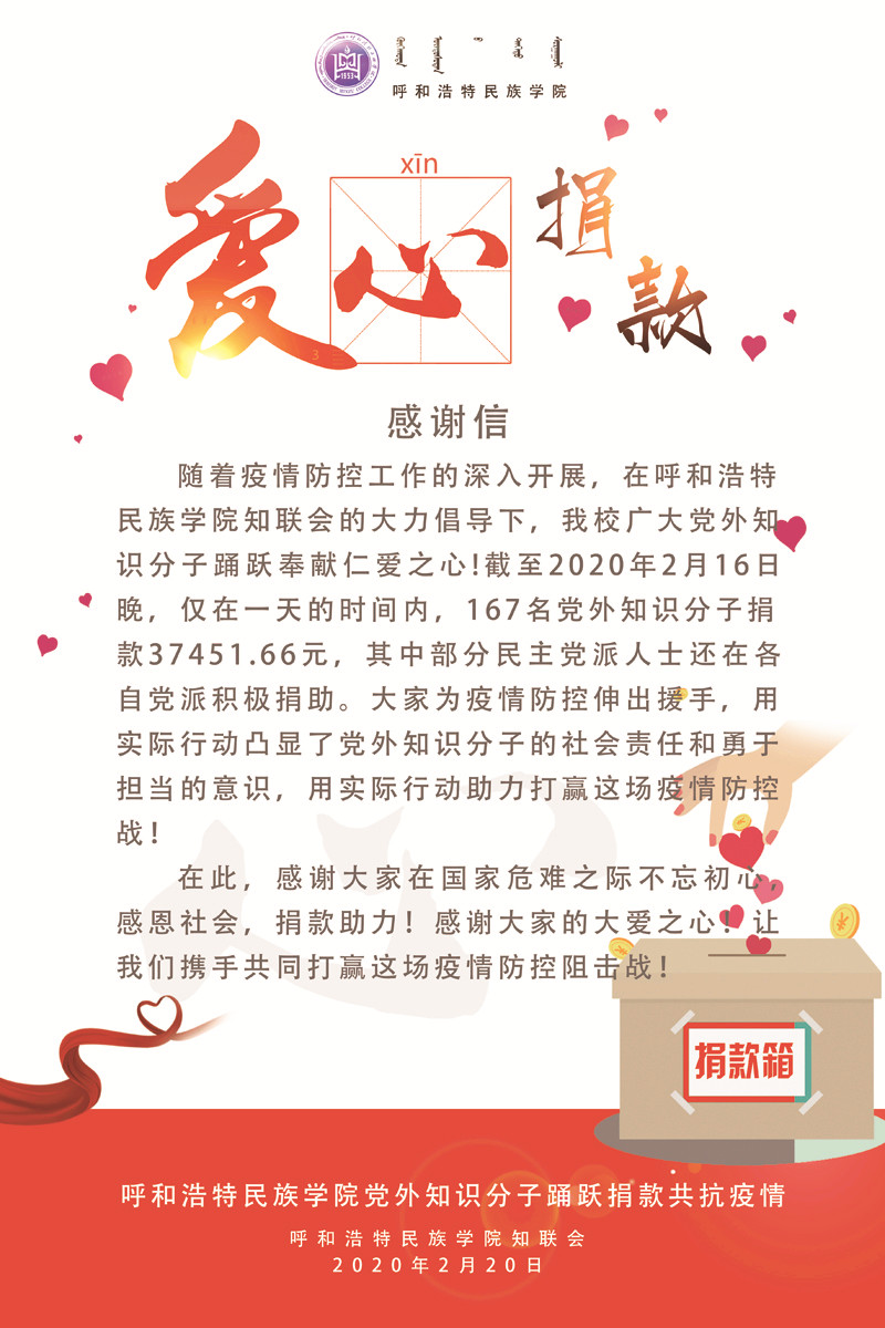 病毒无情,人间有爱。Beat365党外知识分子同心同行,众志成城,奉献爱心。在知联会的倡导下,167名党外知识分子在一天之内自发筹得捐款37451.66元,部分教师在捐款金额里体现了祝福和期望,寄语“一同协力,顺利度过难关”的期望。爱心捐款全部交由内蒙古红十字会,用于湖北地区疫情防控专款。