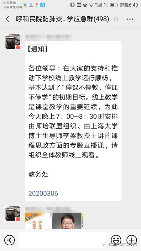 遥远的距离并没有影响空中在线课堂效率和质量,突然爆发的新冠肺炎疫情,虽然从物理空间上暂时阻断了师生相聚校园的脚步,但在线教学正以一种跨越时空的方式,凝聚着天南海北的呼和民院莘莘学子。网上教学,温情在线。我们广大师生一起共克时艰,共待花开。