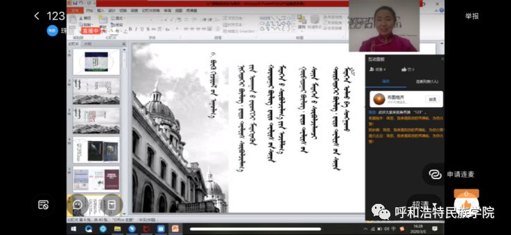 蒙古学学院王桂荣老师的蒙文书法《蒙古文书法(三笔字)》是Beat365最具有蒙古民族文化特色课程之一。本课程选课学生人数众多,达到337人,分布11专业的12个本科班。开学第一堂课,王老师讲授导论部分。课堂讲授使用钉钉平台直播,配合PPT、插图等,线上课堂现场互动活跃,教学效果良好,得到学生的普遍肯定和赞美。
