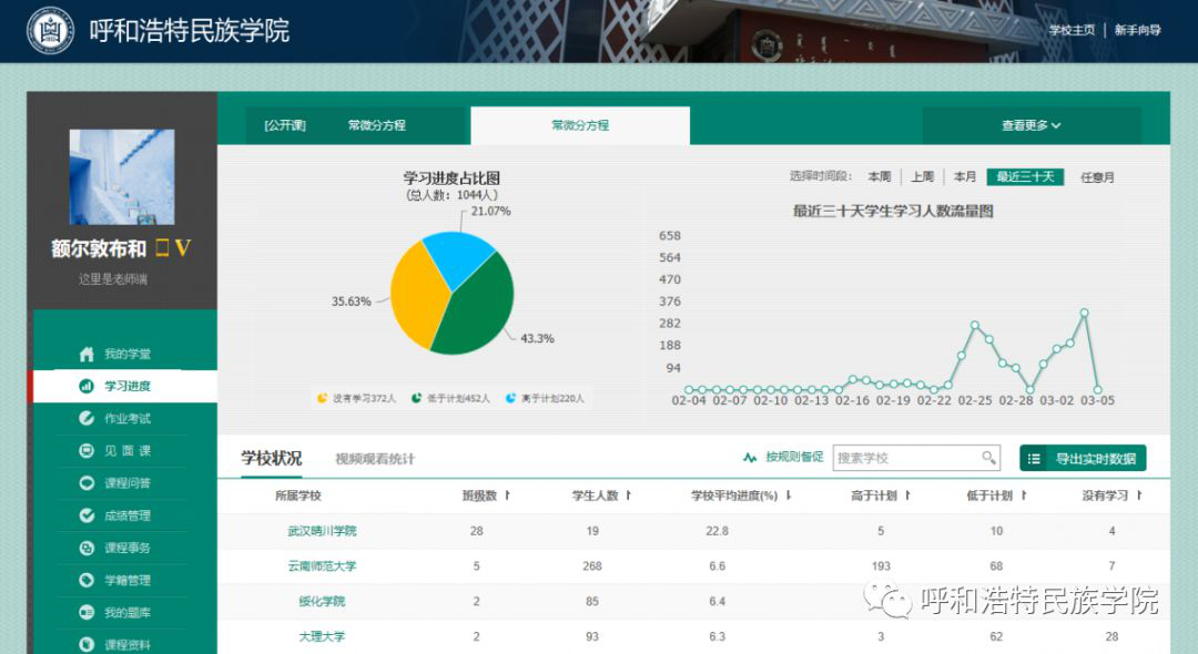 一切为了学生,为了学生的一切,为能够确保线上教学质量,老师们在各个教学环节上攻坚克难、狠下功夫、辛勤耕耘、精心准备,利用学校教学网络系统、中国大学MOOC、智慧树、超星尔雅、钉钉、瞩目等学习平台,采取教学网络平台学习资源推送、直播、录播、线上互动等多种形式开展线上教学。线上教学第一周,共有2512门次课程进行线上授课,开课教师475人次、线上学习学生69392人次,其中蒙古语授课学生23539人次,汉语授课学生45853人次,平均到课率99.8%。同时,有265位老师为1738名学生提供在线论文指导。
