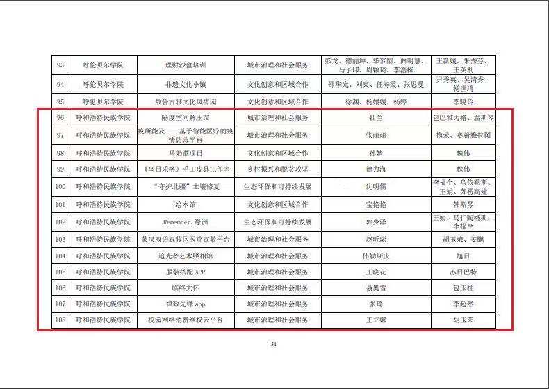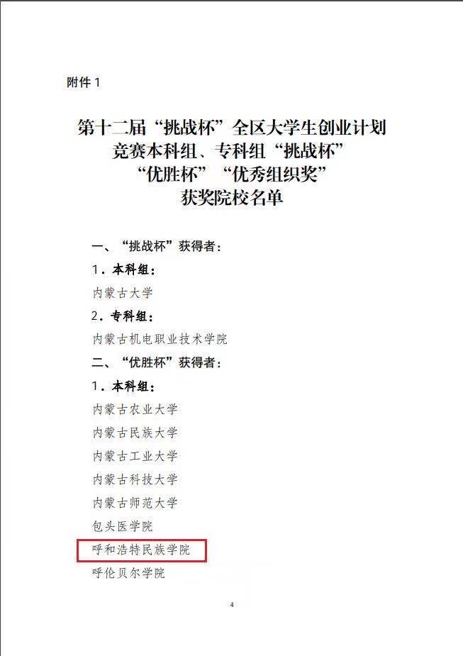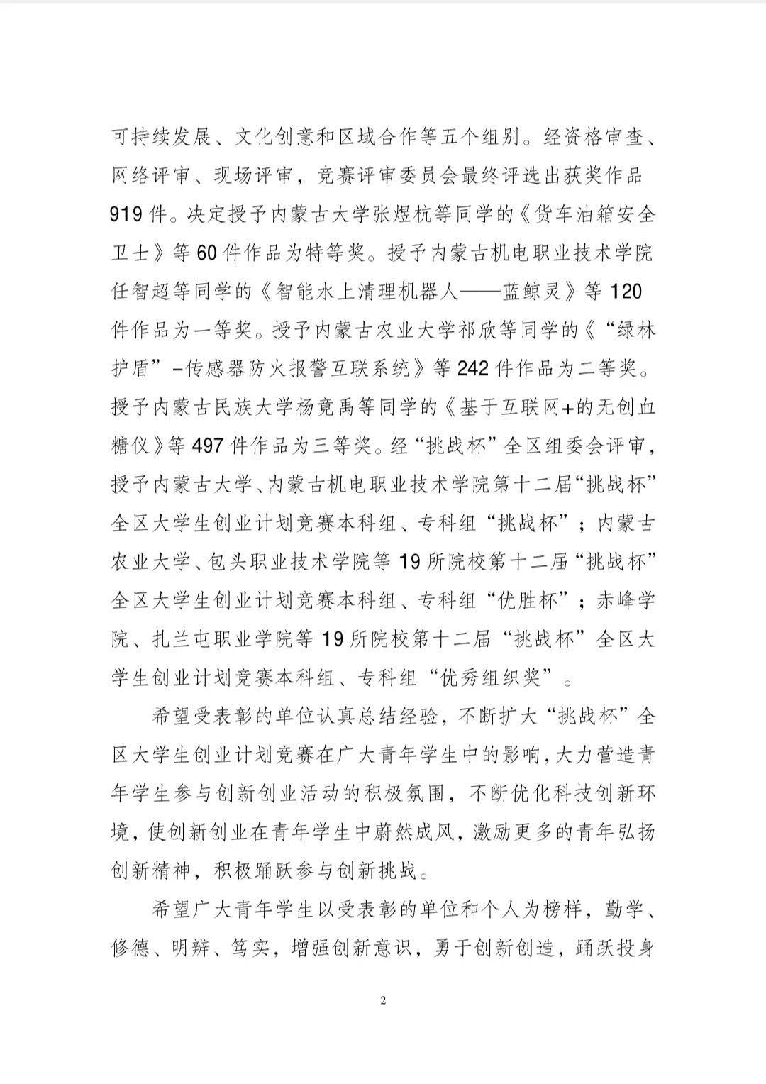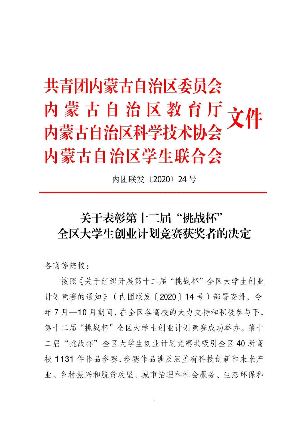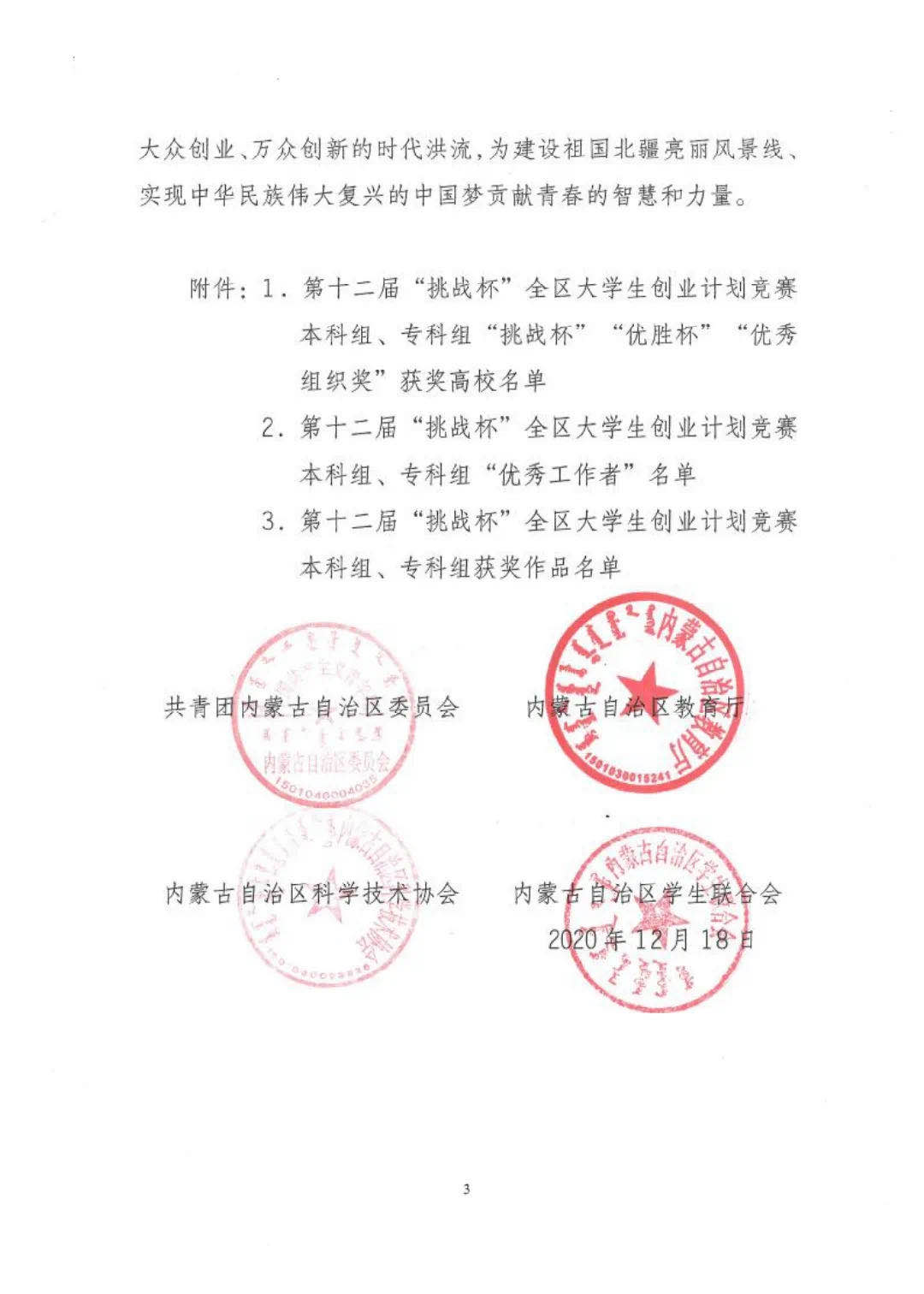 12月18日,共青团内蒙古自治区委员会、内蒙古自治区教育厅、内蒙古自治区科学技术协会和内蒙古自治区学生联合会发布关于表彰十二届“挑战杯”全区大学生创业计划竞赛获奖者的决定。