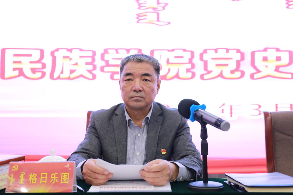 格日乐图校长在主持会议时提出三点要求,一要高起点谋划。学校各党总支、党支部要扛起主体责任,紧紧围绕党史学习教育目标要求,根据学校党史学习教育实施方案,成立领导机构,拟定活动方案计划,统筹抓好组织实施,推动学习教育走深走实。党员领导干部要准确把握党史学习教育的特点和规律,带头先学一步,学深学透,带头讲党课、抓调研,带头推进内容、形式、方法创新,增强自身的引领力、学习力。二要高标准推进。各党总支、党支部要结合实际,挂图挂表作战,聚焦抓常态,对党员、干部的日常学习勤引导、勤督促。聚焦抓融合,把党史学习教育融入教学管理、人才培养等重点工作,把党史中的宝贵营养转化成实实在在的政治素养和能力水平,不断增强推进工作的系统性、预见性、创造性。三要高质量见效。要按照孙书记动员讲话要求,把学习教育与学校秉承的教育理念、确立的办学定位结合起来,铸牢中华民族共同体意识,培铸民族团结之根、民族和睦之魂,持续呵护好“模范自治区”崇高荣誉;与学校办学理念、确立的人才培养目标结合起来,为自治区经济社会发展培养大量的应用型人才;与提高党的建设质量、推进全面从严治党结合起来,学思用贯通、知信行统一,奋力开创学校发展的新局面,以优异成绩向建党100周年献礼。