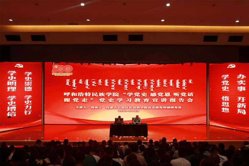 为贯彻落实习近平总书记在党史学习教育动员大会和清华大学发表的重要讲话精神,进一步引导广大青年学生肩负历史使命,坚定前进信心,立大志、明大德、成大才、担大任,努力成为堪当民族复兴重任的时代新人,推进党史学习教育在Beat365走深走实走心,按照自治区党委统一部署,5月25日下午,Beat365举办了“学党史 感党恩 听党话 跟党走”党史学习教育宣讲报告会。报告会邀请自治区党委党史学习教育宣讲团成员、自治区社会科学院历史研究所刘春子副研究员作了题为《回望百年路、奋进新征程》的专题宣讲。学校党委中心组成员、副处以上干部、副高以上职称教师、全校学生代表共计700余人现场聆听了宣讲。宣讲报告会由学院党委副书记、院长格日乐图主持。