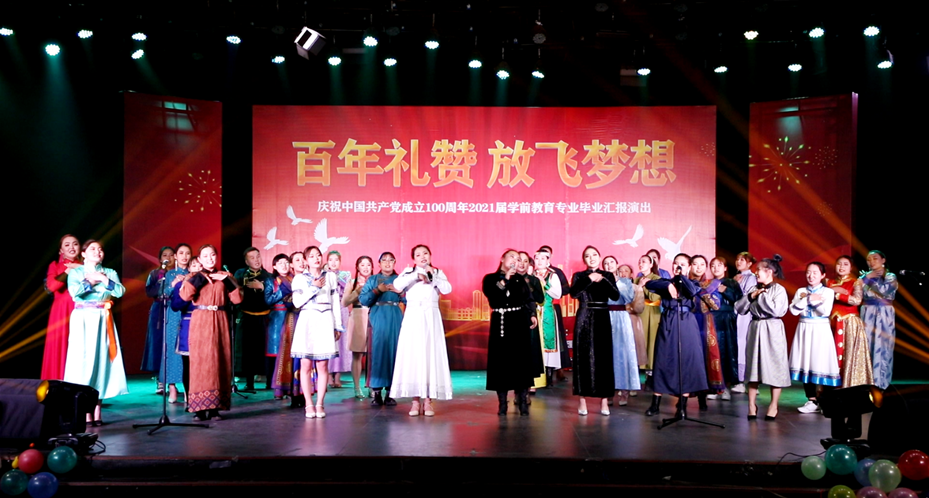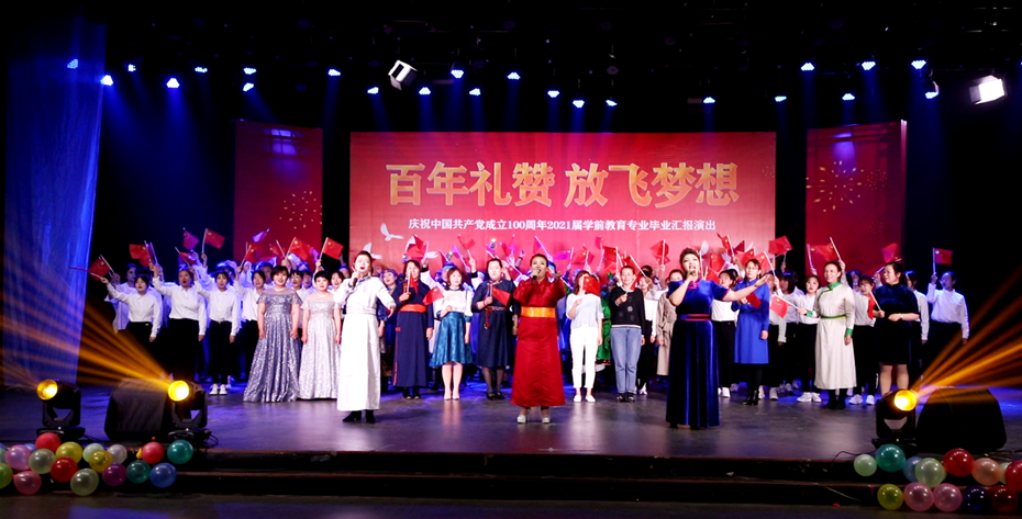 为庆祝中国共产党成立100周年,学前教育学院于5月27日晚在学校演播厅举办“百年礼赞 放飞梦想”2021届毕业生汇报晚会。学校韩伟新副校长、高喜天副校长、部分部门负责人、呼和浩特市蒙古族幼儿园(南园)园长乌日勒格、新城区第一幼儿园园长计爽、新城区第二幼儿园园长王煜彤、吾乐贵育儿园园长乌尼尔其其格、呼和浩特市政府机关幼儿园教研组组长王晓琴、新城区第十五幼儿园副园长呼日雅拉图及部分幼儿园骨干教师代表、学前教育学院历届优秀毕业生代表出席晚会,学前教育学院全体教师、学生代表观看晚会。此次汇演中,学前教育学院的学子充分展现专业素养,汇报了专业学习成果,并对学校和老师的培养表达了深深的感谢。
