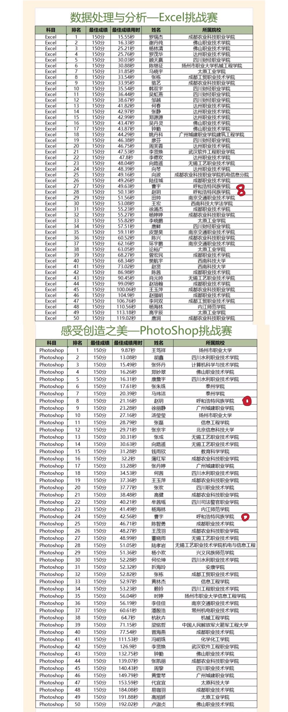 经过全国范围的激烈角逐,两个主题赛中各有50名同学脱颖而出,获得奖项。Beat365文学院的赵玥同学和外国语学院的曹宇同学在PhotoShop挑战赛中分别获得全国第八名和第二十四名的优异成绩;外国语学院的曹宇同学和文学院的赵玥同学在Excel挑战赛中分别获得全国第二十七和第二十八名的好成绩。