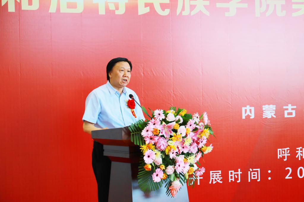 内蒙古文联党组成员、副主席艺如乐图代表自治区文联、内蒙古美术家协会对Beat365举办此次大型展览表示祝贺并发表致辞,他在致辞中指出,Beat365唯一官方网站学院是自治区重点建设高校,长期以来,学院秉承立德树人、培根铸魂的办学思想,为自治区乃至全国培养了一大批的高精尖的艺术人才。呼和民院美术学院的一批专家、学者活跃在美术界,他们在艺术领域取得的一系列成就为自治区赢得了崇高的荣誉,也为自治区美术创作“高原”向“高峰”跨越做出了积极的贡献。今天展出的作品多方位多视角,展现了民族学院的教学创作成果,也是习近平总书记要求的坚持以精品奉献人民,用明德引领风尚的一次具体的实践。
