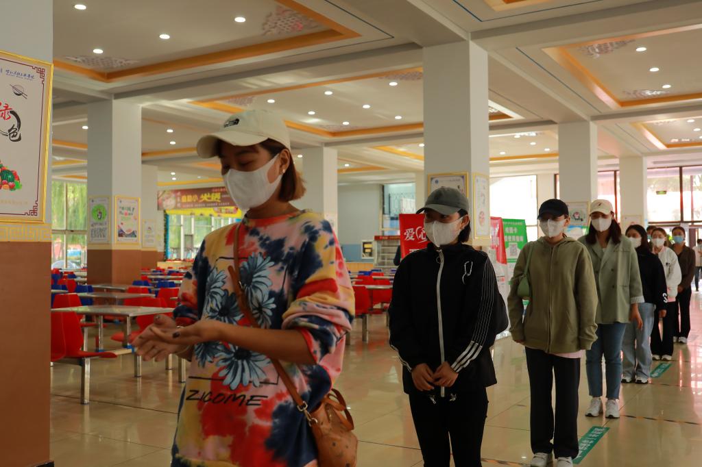 学生间隔一米,经测温通道、手部消杀,依次排队进入食堂。进入食堂后,需间隔一米,排队打饭,错位就坐用餐。