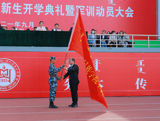 随后,格日乐图校长向承训教官授军训旗。