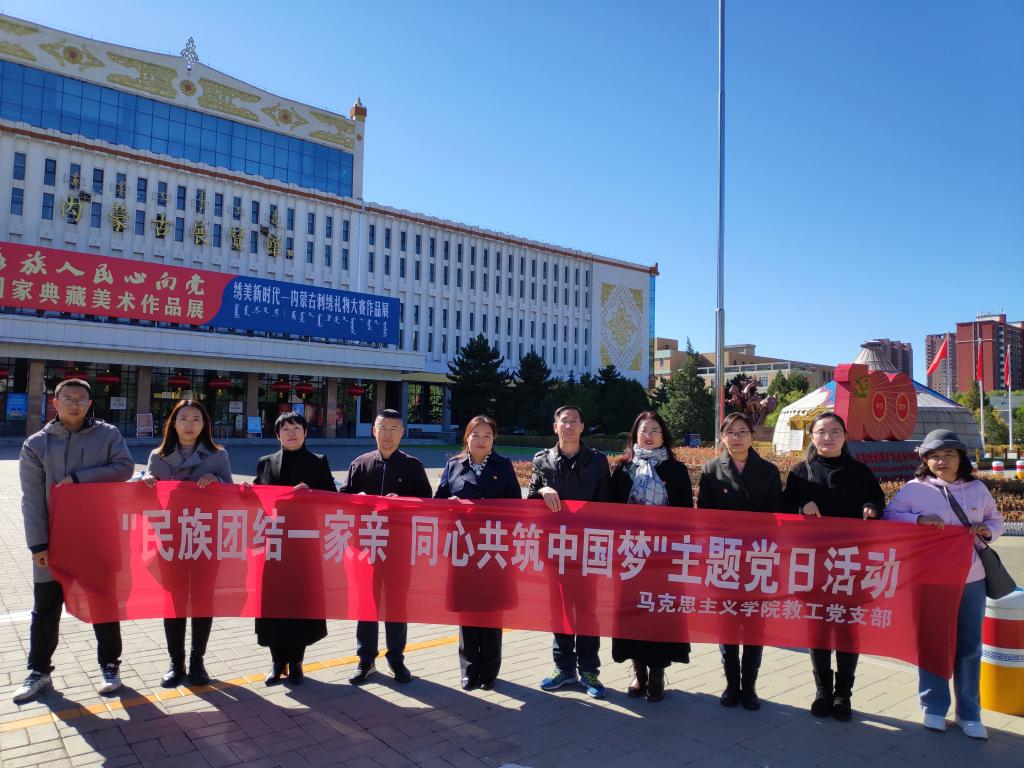 为贯彻落实中央民族工作会议精神,推动民族团结进步教育,马克思主义学院教工党支部开展“感党恩 听党话 跟党走”主题党日活动。10月22日马克思主义学院教师党员赴内蒙古展览馆观看“各民族心向党——国家典藏美术作品展”。