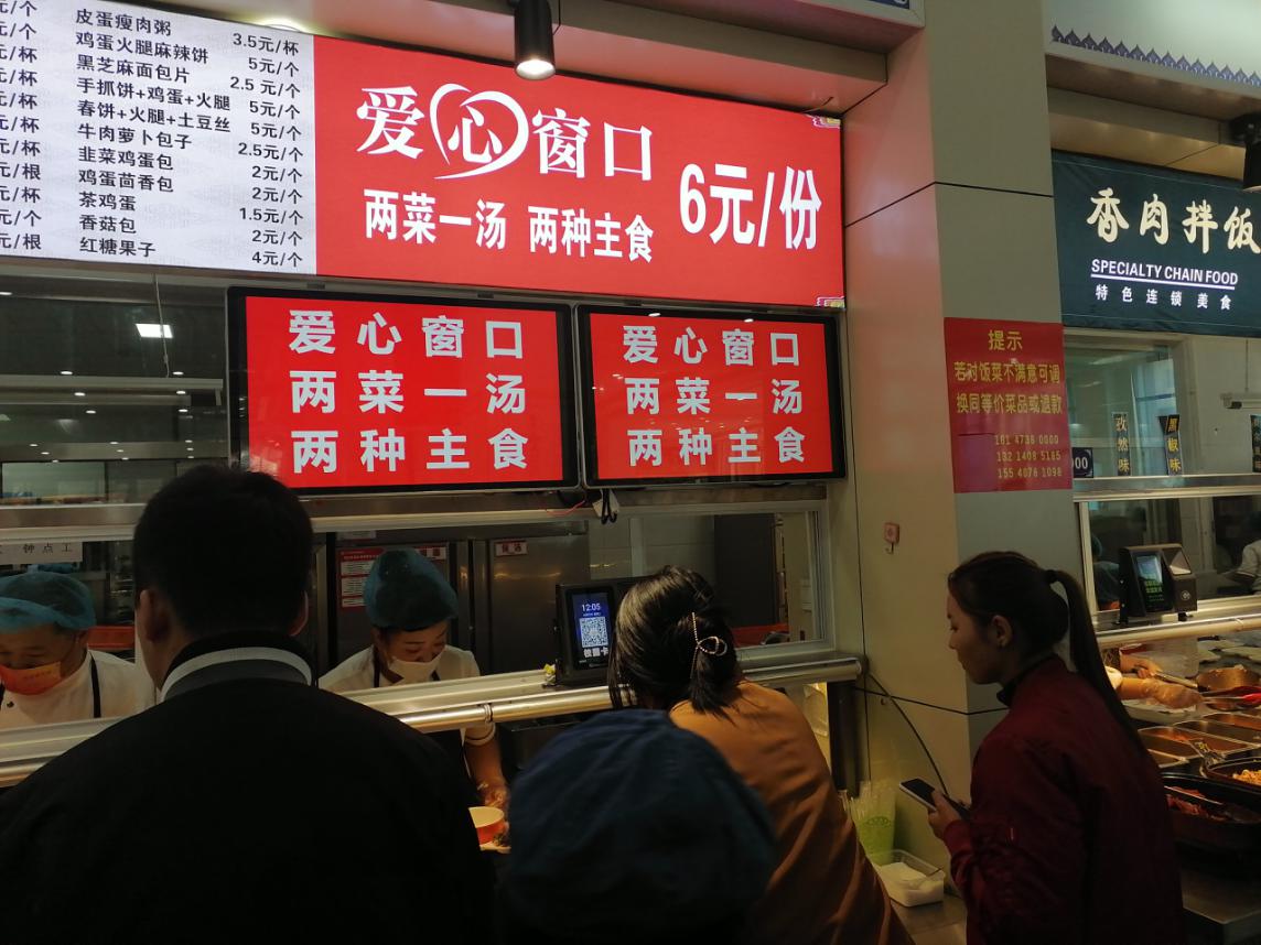 学校提供政策支持帮扶,后勤管理处党支部在南、北食堂开设每份6元的“爱心窗口”。每个爱心窗口每餐安排5道热菜、2种主食、1种汤,每天不重样,中午与晚上皆开放,学生可自选2菜1主食1汤。每天平均卖出1000余份爱心餐。爱心窗口的开设深受学生们的喜爱,获得一致好评。同学们纷纷表示,“爱心餐物美价廉,缓解了同学们的经济压力,吃着爱心菜,心里感觉很温暖”。