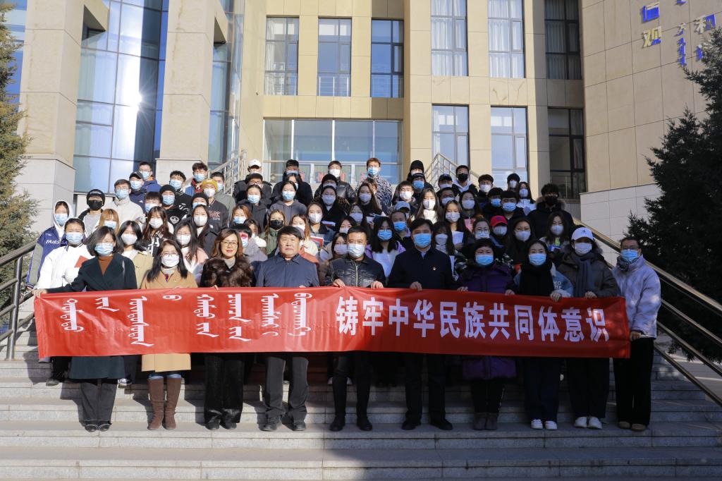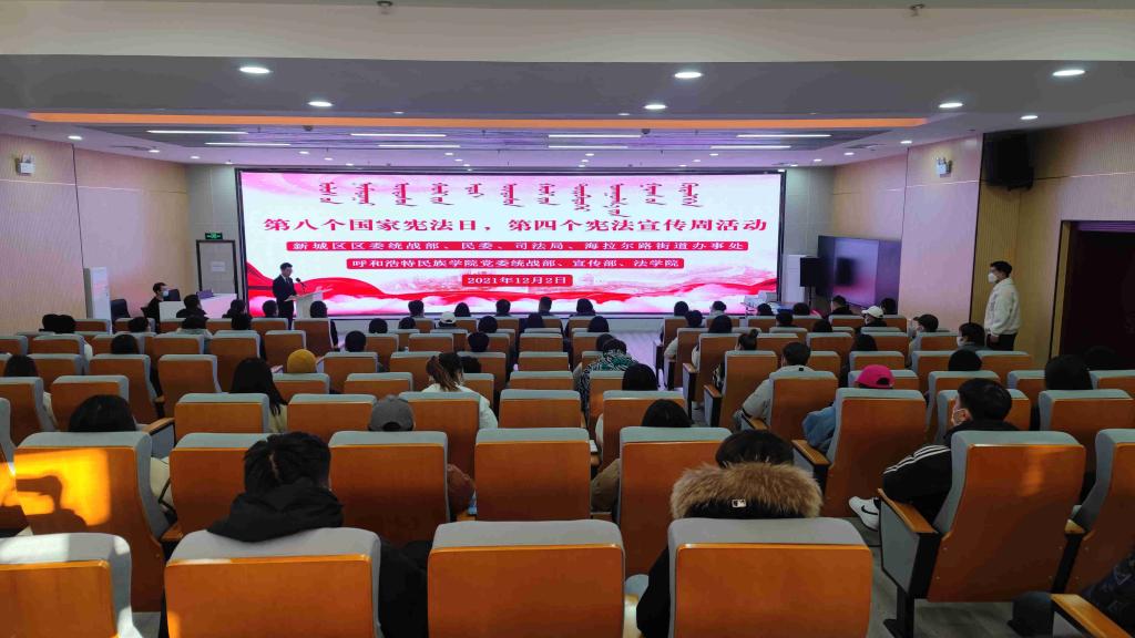 2021年12月4日是第八个国家宪法日,11月29日至12月5日是第四个“宪法宣传周”。为深入学习宣传贯彻习近平法治思想,深入学习习近平总书记关于加强和改进民族工作的思想,结合学习贯彻落实中央和自治区党委民族工作会议精神,维护宪法权威,12月2日上午,新城区区委统战部、民族事务委员会、司法局和海拉尔大街街道办事处党工委、海东路司法所一行10余人,由新城区民族事务委员会副主任李锐锋带队,来学校开展普法活动。学校党委委员、统战部部长包君及学校党委统战部、宣传部、法学院、民族学学院、铸牢中华民族共同体意识研究基地相关人员及学生代表100余人参加普法活动。