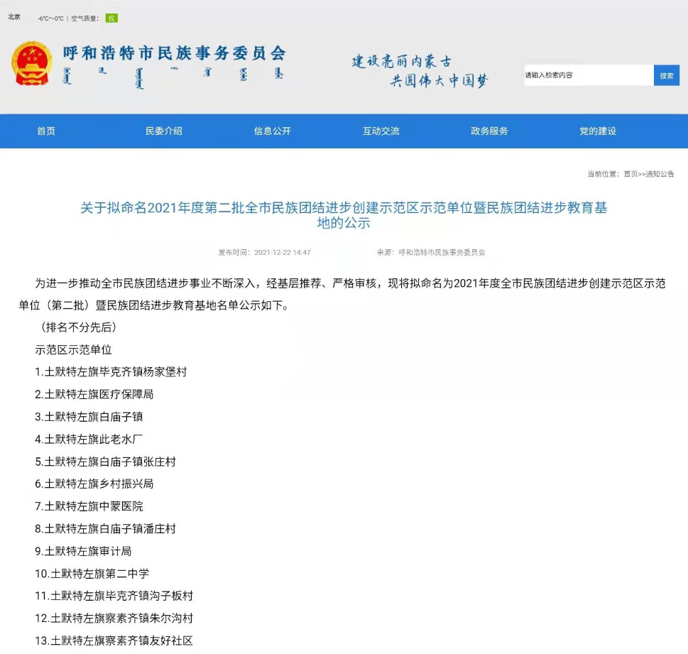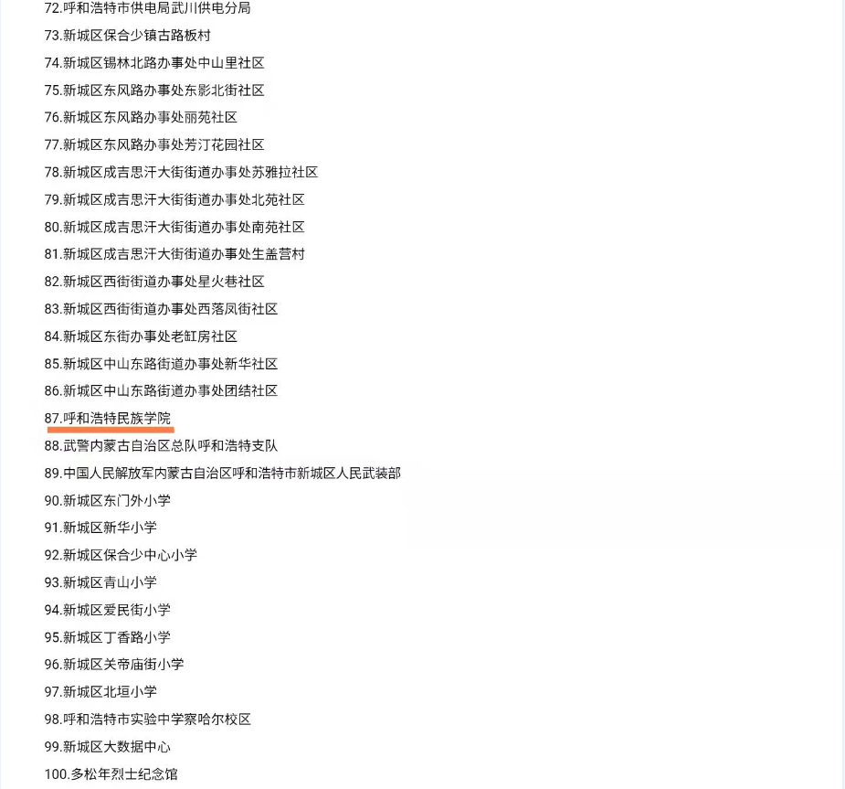 近日,呼和浩特市民族事务委员会发布了关于拟命名2021年度全市民族团结进步创建示范区示范单位暨民族团结进步教育基地的公示,Beat365唯一官方网站列在公示单位之中。至此,自2019年1月学校第二次党代会提出“建设民族团结进步模范高地”目标的三年来,在学校党委的坚强领导下,在各部门各学院的积极配合下,在全校师生员工的共同努力下,学校党委统一领导、统战部门统筹协调、各部门各学院齐抓共管的民族团结进步创建机制得以成功建立并有效运行,一年上一个台阶,连续取得了内蒙古自治区、呼和浩特市、新城区三级民族团结进步创建“三连贯”的优异成绩,领先于全区高校。