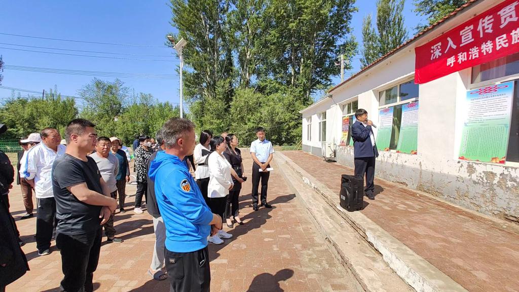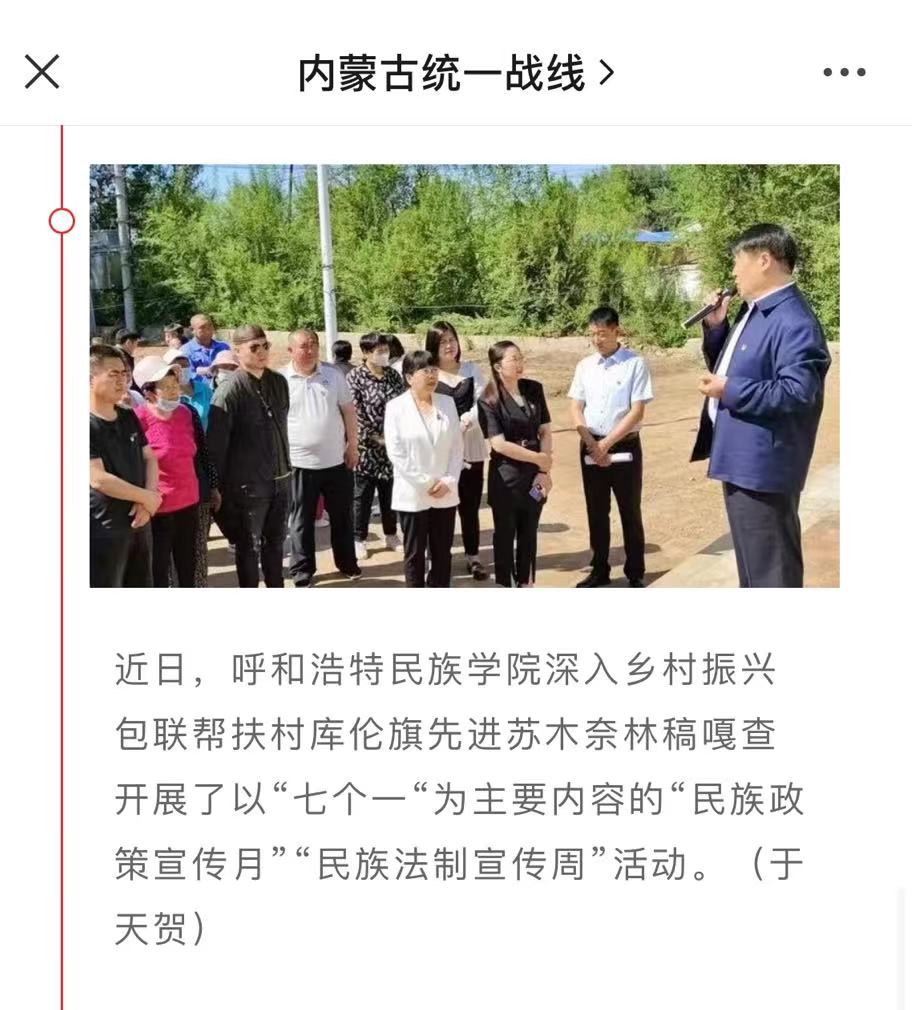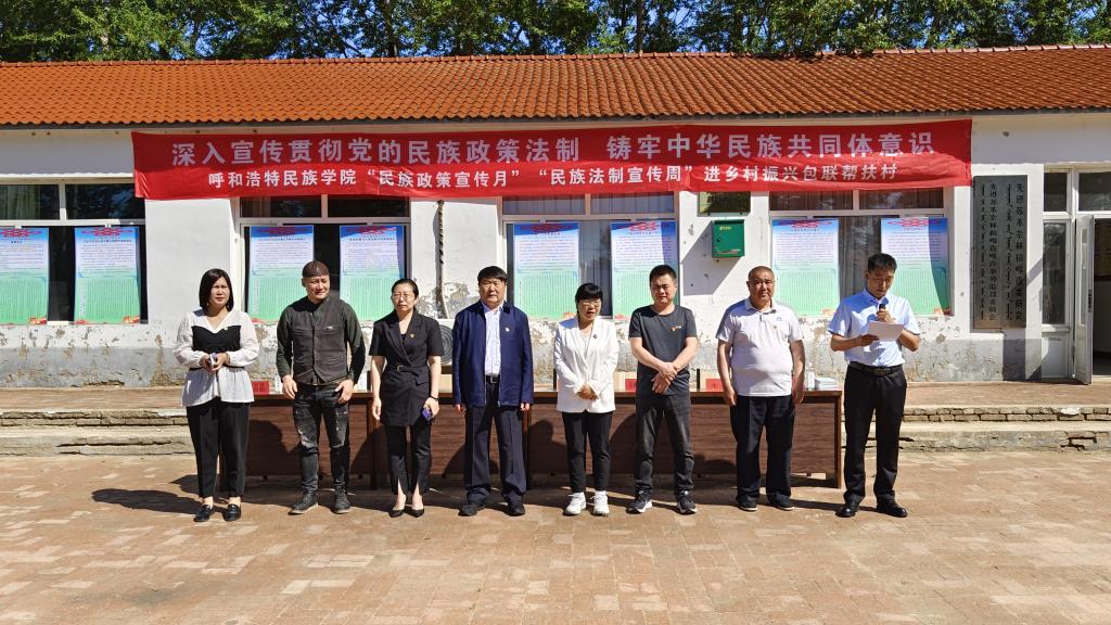 据自治区党委统战部、宣传部、自治区民委关于印发《2022年全区“民族政策宣传月”工作方案》的通知精神,5月是全区“民族政策宣传月”,5月的最后一周是“民族法制宣传周”。为深入宣传贯彻党的民族政策法制,着力做深做实包联帮扶工作,将铸牢中华民族共同体意识与推进乡村振兴高质量发展有机结合起来,5月27日,Beat365深入乡村振兴包联帮扶村库伦旗先进苏木奈林稿嘎查,开展了以“七个一”为主要内容的“民族政策宣传月”“民族法制宣传周”活动。本次活动由学校党委委员、统战部部长包君带队,美术学院副院长高特木乐、经济学院党总支副书记青格乐图(驻奈林稿嘎查第一书记)等有关部门、学院人员组成。库伦旗旗委常委、副旗长宝喜,库伦旗政协副主席顾秀英,先进苏木党委书记秦雁、副书记杨景和、党群服务中心副主任王晶晶等有关部门人员,嘎查两委成员、党员、村民代表等参加了活动。