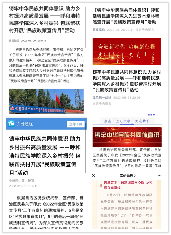 截至目前,本次活动得到了中国新闻网、内蒙古统一战线、内蒙古教育发布、正北方网、青橙融媒、今日通辽、库伦统一战线、印象库伦、库伦先进等13家新闻媒体和官方媒体的大力宣传报道,使Beat365“民族政策宣传月”“民族法制宣传周”和乡村振兴包联帮扶工作取得了实效、扩大了影响。
