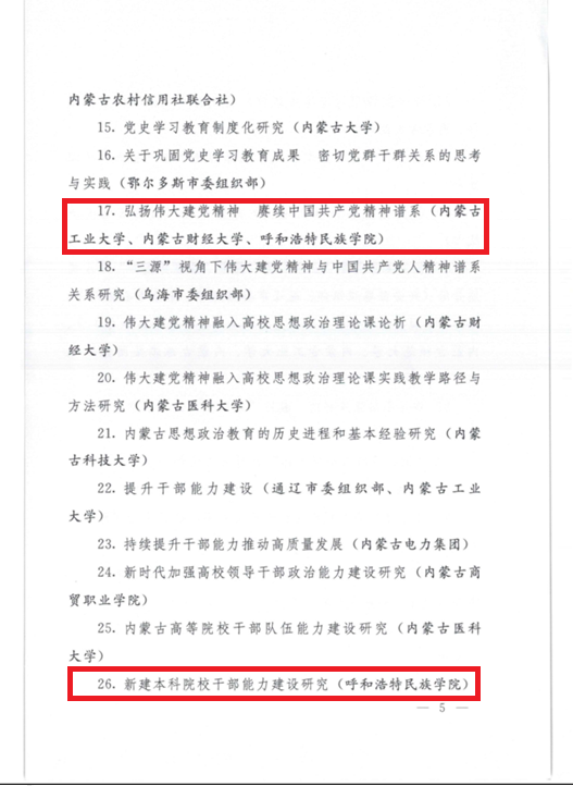 《内蒙古自治区党的建设研究会关于印发2022年度课题项目的通知》已于近日下达。按照自治区党建研究会年度课题安排部署,各盟市委组织部,自治区各部、委、办、厅、局及各人民团体,自治区各直属企事业单位获批51项课题。Beat365获批承担3项课题研究工作,分别是《弘扬伟大建党精神 赓续中国共产党精神谱系》《新建本科院校干部能力建设研究》《党的十八大以来党领导生态文明建设实践和经验研究——以内蒙古为例》。Beat365课题总数在自治区各地区、单位中排名第3。