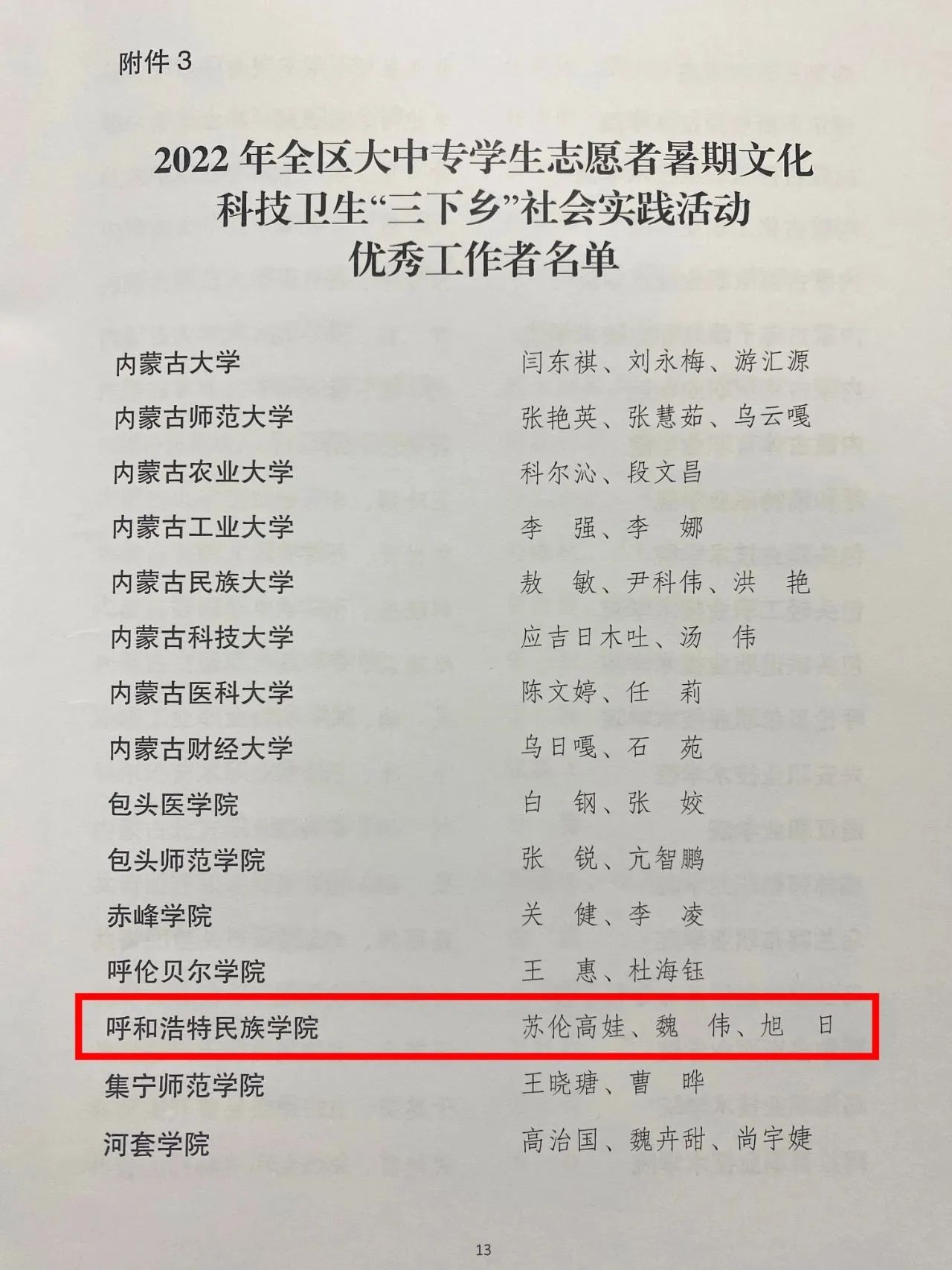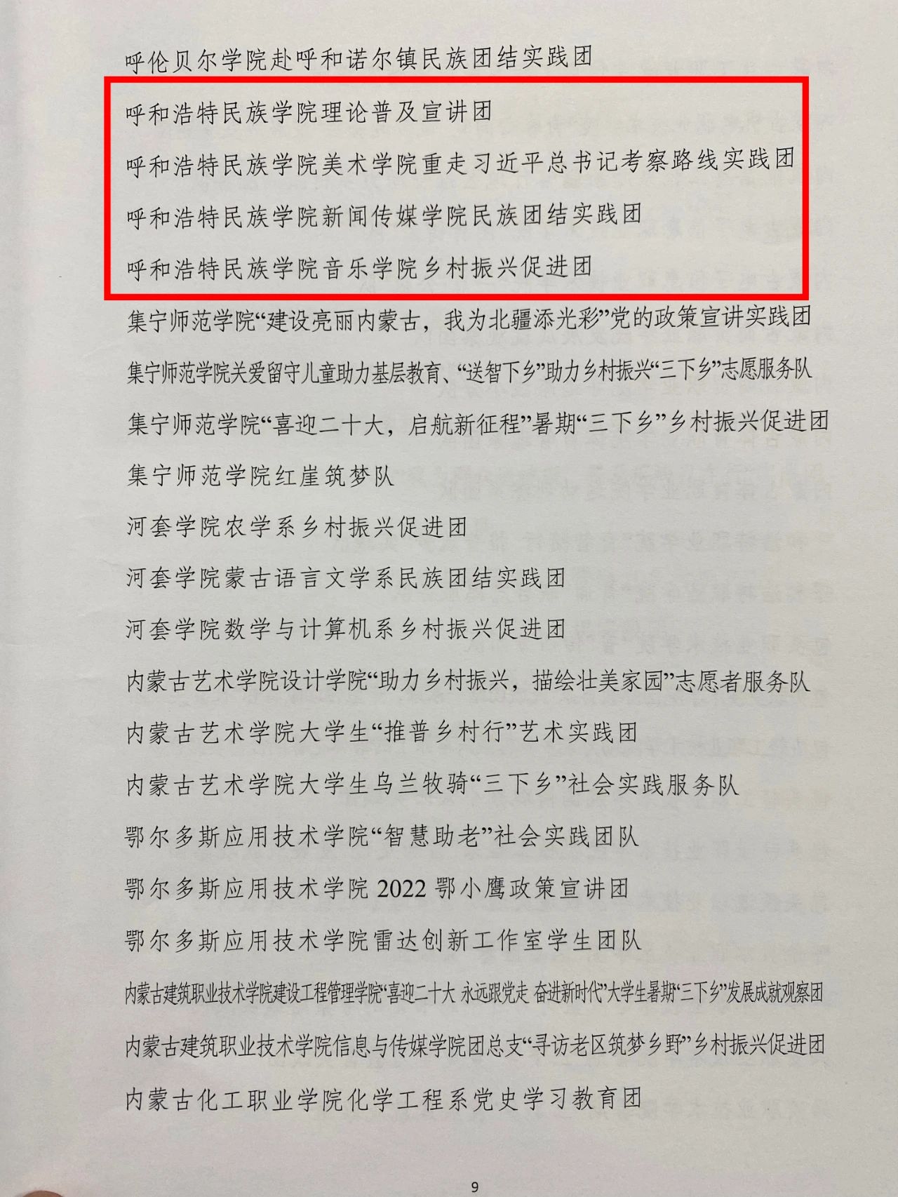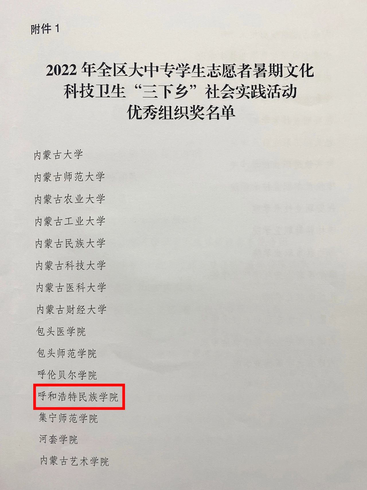 在本次表彰中,Beat365荣获2022年全区大中专学生志愿者暑期文化科技卫生“三下乡”社会实践活动“优秀组织奖”;Beat365唯一官方网站理论普及宣讲团、美术学院重走习近平总书记考察路线实践团、新闻传媒学院民族团结实践团、音乐学院乡村振兴促进团获评全区“优秀志愿者服务队”;苏伦高娃、魏伟、旭日3名教师获评全区“优秀工作者”;胡宝泉、吴那仁朝格图、瑙莫汗、刘晓、包为为5名教师获评全区“优秀指导教师”;潘尔丹、白国忠、邢京林等15名同学获评“优秀志愿者服务队员”。