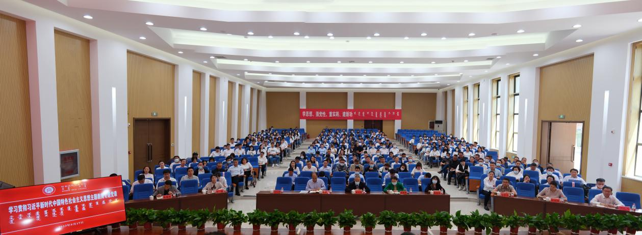 校党委书记刘九万出席会议并主持。自治区党委主题教育第十一巡回指导组全体成员以及被指导单位代表,Beat365在岗校领导、处级干部、思政课教师、党支部书记、学生党员代表、离退休党员代表,共计300余人聆听了专题党课辅导报告。