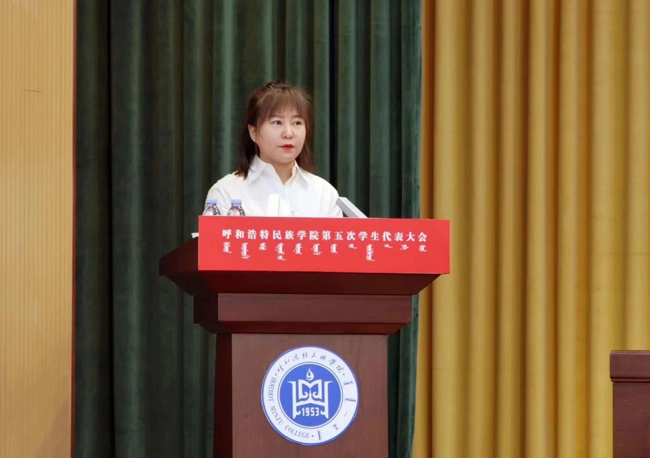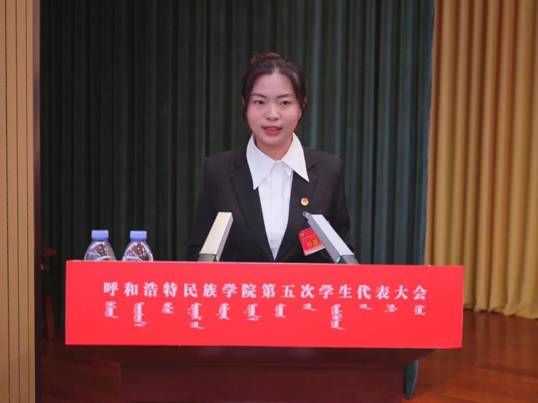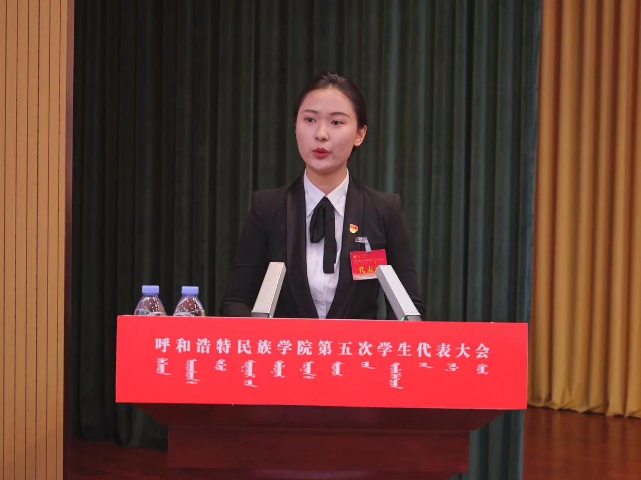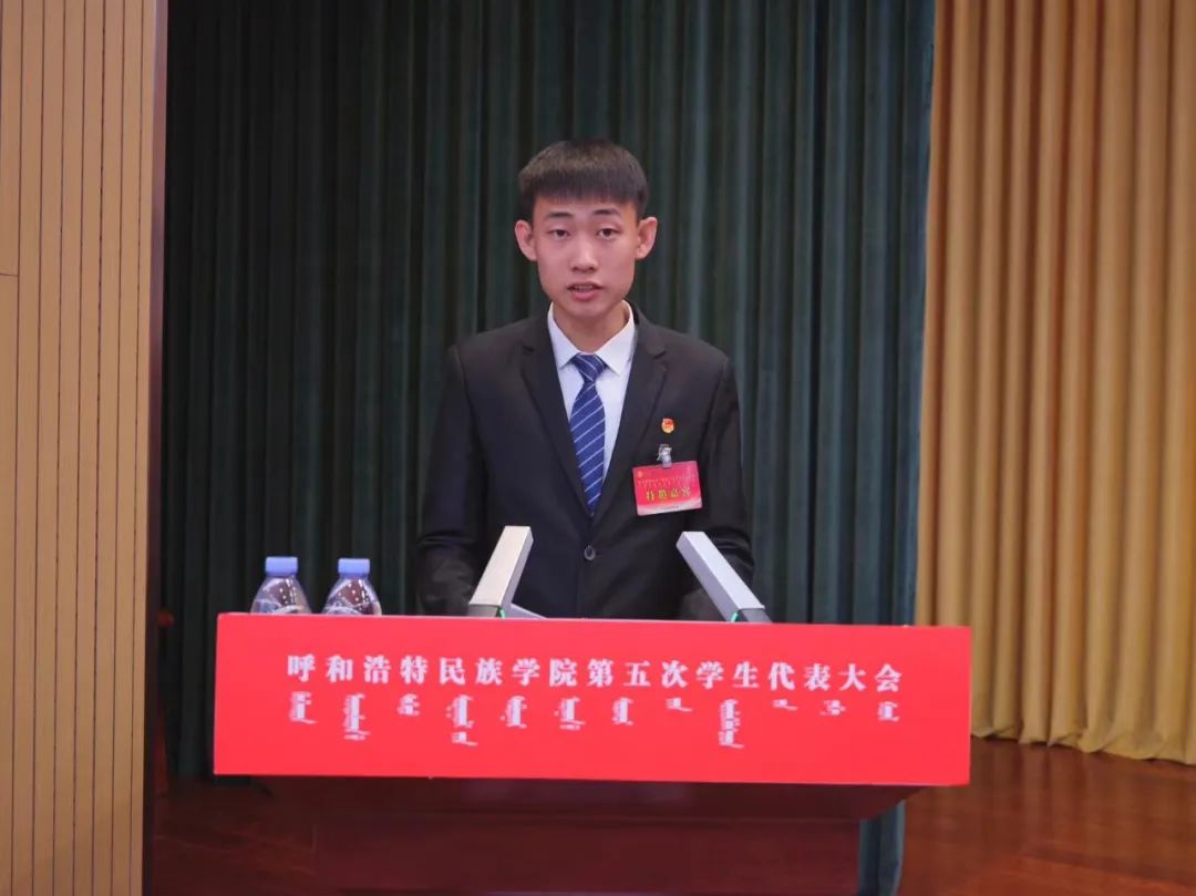 随后,与会领导向学生代表赠书;会议听取了蒋昊言同学所作的《踔厉奋发,勇毅前行,为全面建设现代化强国,实现中华民族伟大复兴,贡献民院学子的青春力量》的工作报告。报告总结了第四次学生代表大会以来学生组织的工作与所获成果,对学生组织的工作目标和任务做出了规划,并号召同学们要顺应时代潮流,准确识变、科学应变、主动求变,立足国家和社会需要,不断推进改革创新,勇敢肩负起新时代强国荣校的历史使命,彰显新时代呼民院青年的担当作为,为学校高质量发展、全方位建设“模范自治区”贡献呼民院学子的青春力量!