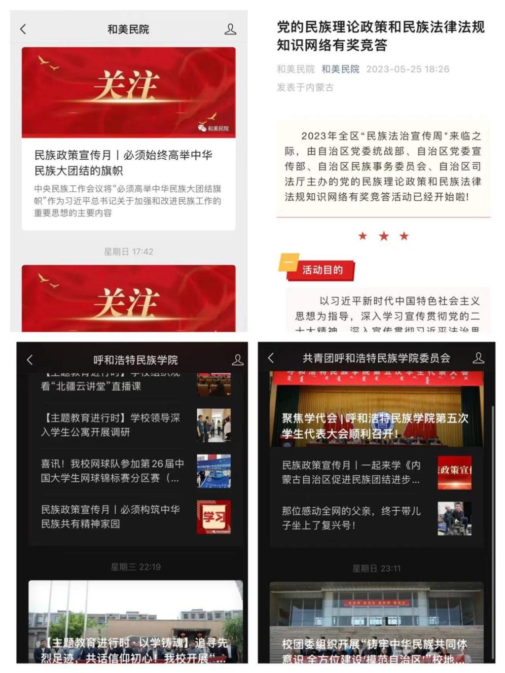 二、坚持多点开花,强化学习宣传。活动月期间,广泛深入开展民族政策和民族法治宣传教育。各党总支开展专题理论学习18次,实践学习27次。学报《蒙古学研究》面向社会和学校征集优秀论文,组织全校师生参加“党的民族理论政策和民族法律法规知识网络有奖竞答活动”,1万余人次参与。先后悬挂活动月宣传条幅5条、制作宣传展板8块、编发民族团结知识手册500本、推送微信公众号推文30余条、制作专题视频2期,有效营造校园宣传氛围。