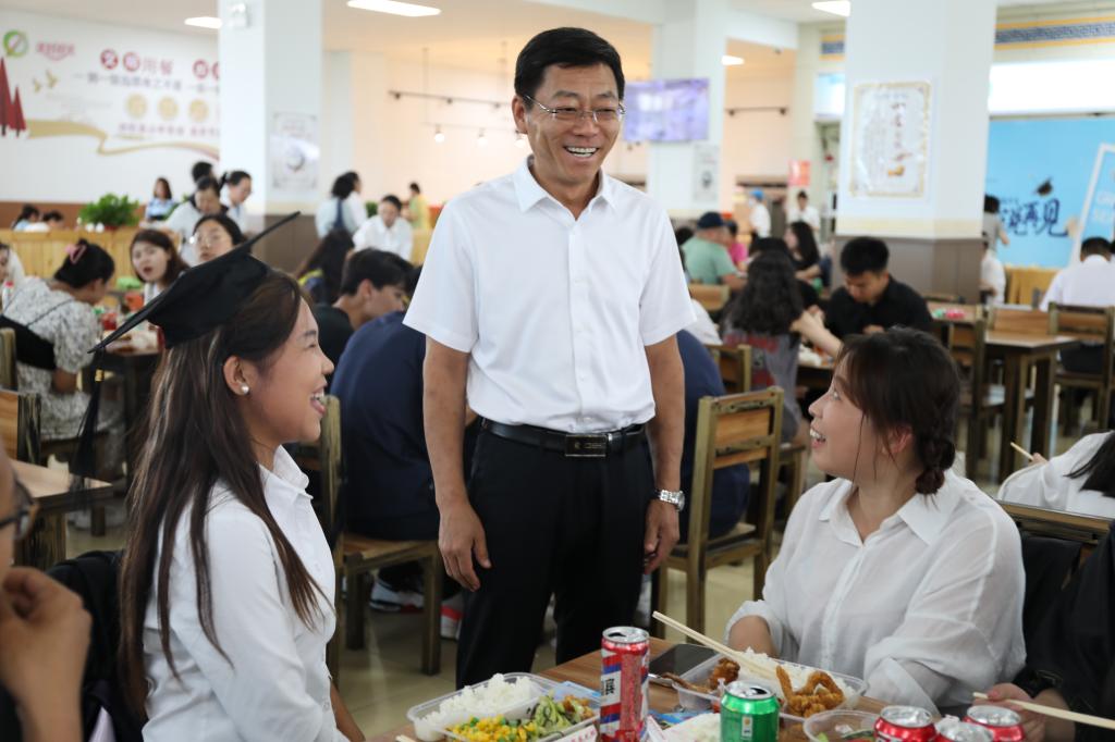 6月29日,Beat3652023年毕业典礼和学位授予仪式结束后,后勤管理处餐饮服务中心结合主题教育,在南餐厅启动“青春不说再见”活动,为毕业生和老师们提供免费午餐,一起品味呼民院味道,以暖心的方式送别毕业生。校长韩伟新、副校长高喜天来到餐厅与毕业生共进午餐,与毕业生亲切交流,了解他们的毕业去向和职业规划。