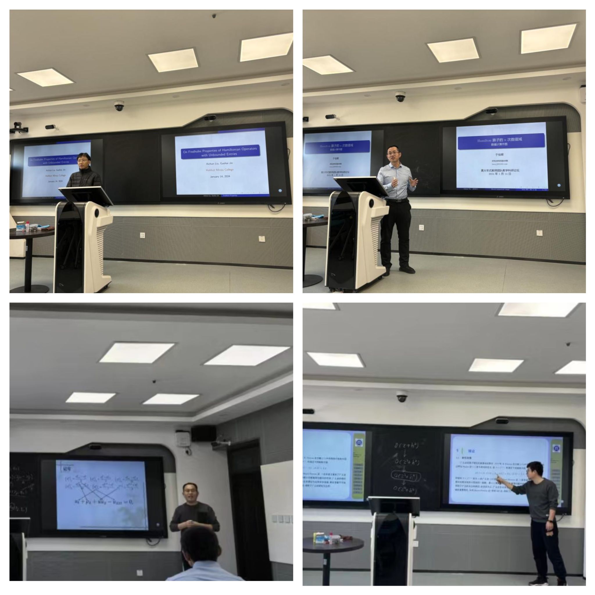 会上,黄大年式教师团队金国海、于佳晖、高晶英、李小鹏四位教师依次分别作了题为“On Fredholm Properties of Hamiltonian Operators with Unbounded Entries” “Hamilton算子的n次数值域”“对称正则长波方程的时间两层差分格式”“Hilbert C*-模上算子矩阵的EP和hypo-EP性”等四场学术报告。