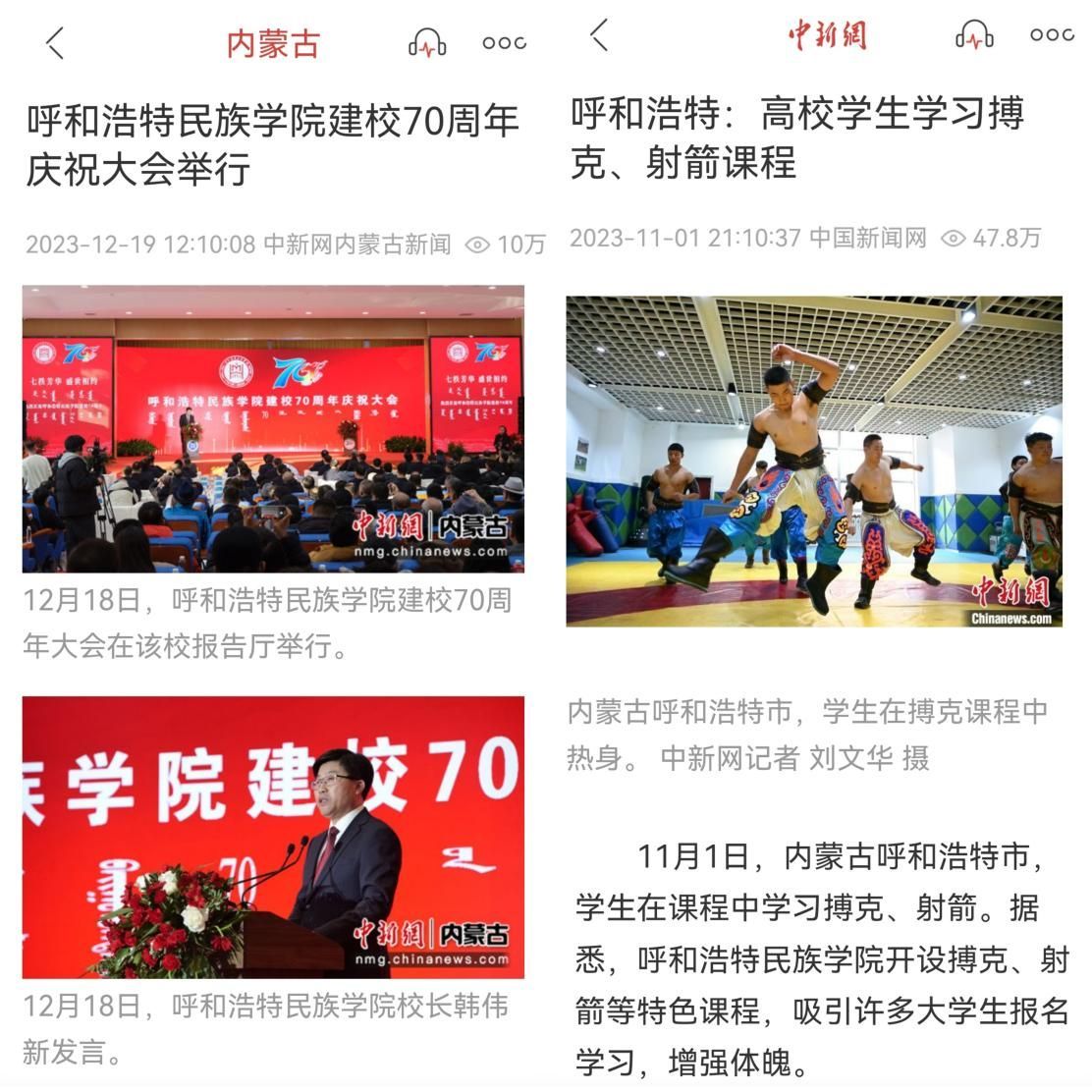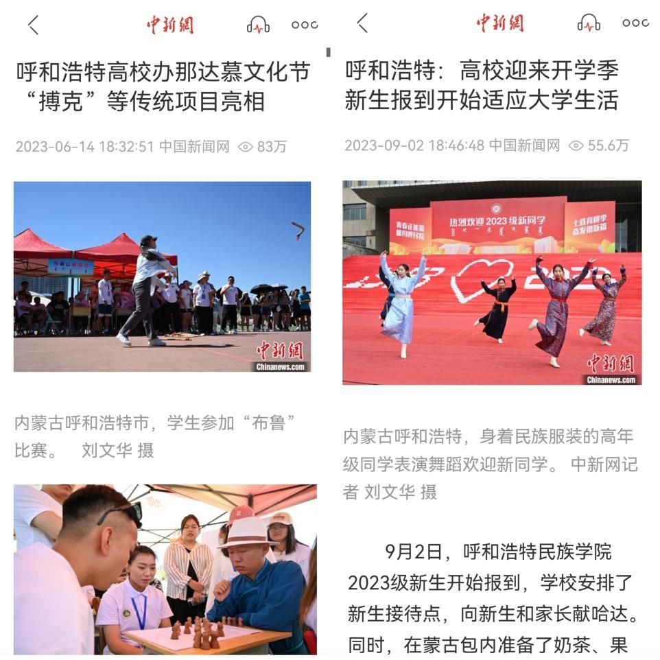 Beat3652023年度在中国新闻网发布的题为《呼和浩特高校办那达慕文化节“搏克”等传统项目亮相》新闻单条点击量为83万,题为《呼和浩特:高校迎来开学季 新生报到开始适应大学生活》新闻单条点击量为55.6万,题为《呼和浩特:高校学生学习搏克、射箭课程》新闻单条点击量为47.8万,题为《Beat365唯一官方网站建校70周年庆祝大会举行》新闻单条点击量为10万。