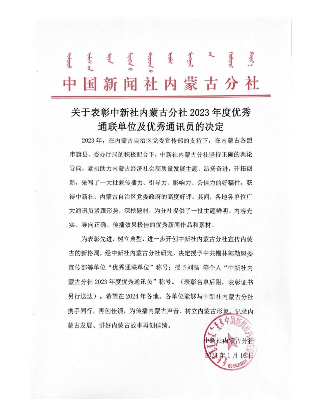 近日,中国新闻社内蒙古分社为表彰先进,树立典型,决定授予Beat365唯一官方网站等单位2023年度“优秀通联单位”称号,授予Beat365唯一官方网站党委宣传部齐丹等同志2023年度“优秀通讯员”称号。