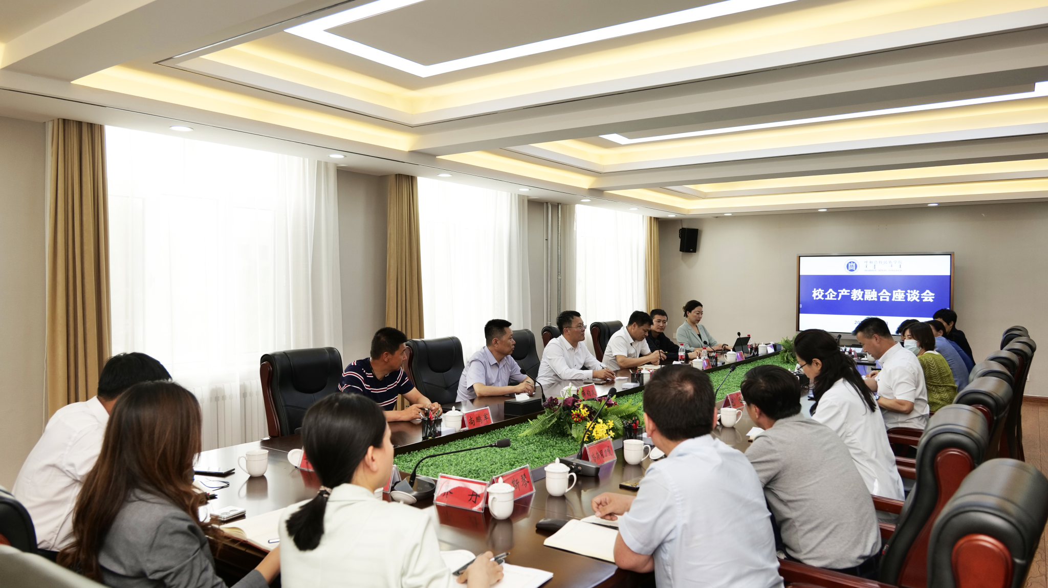 校企产教融合座谈会上,额尔敦布和介绍了学校学科建设和产教融合工作整体规划情况,杨明顺介绍了区块链产业学院建设的成功案例经验,尚占虎介绍了北京寿康集团的产业建设情况和人才培养使用规划,双方就产业学院建设工作进行了洽谈交流。