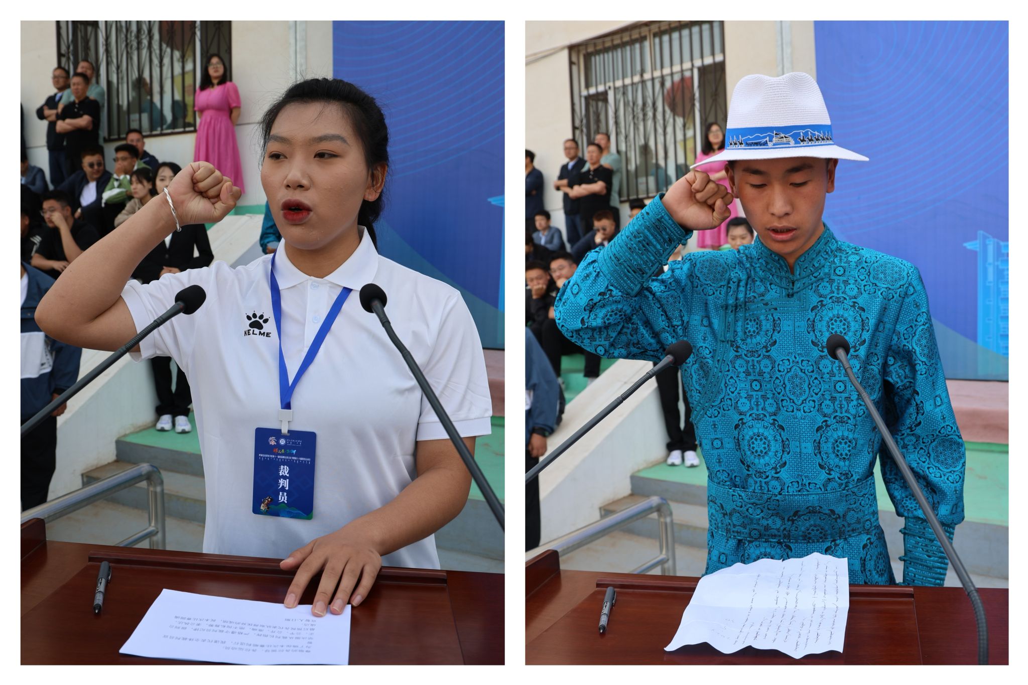 裁判员代表、体育学院徐金凤同学、运动员代表依德日棍同学进行了庄严宣誓。