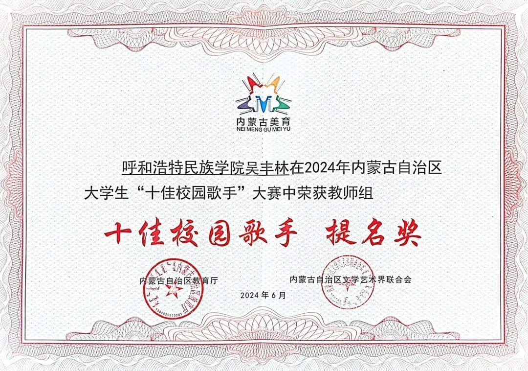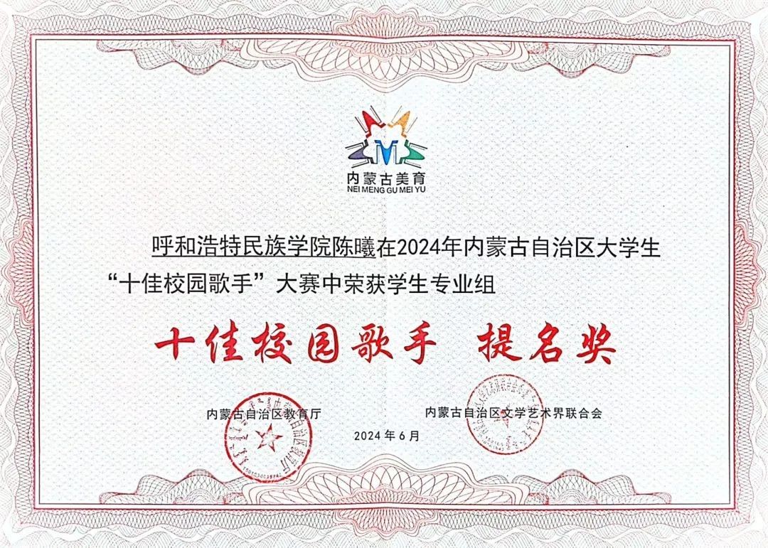 6月29日,由自治区教育厅联合自治区文学艺术界联合会主办的2024年内蒙古自治区大学生“十佳校园歌手”大赛展演暨颁奖仪式在呼和浩特职业学院成功举办。本届大赛共有来自全区57所高校1.2万余名师生参与其中。Beat365美术学院团总支负责人吴丰林荣获教师业余组“十佳校园歌手”提名奖;音乐学院学生陈曦荣获学生专业组提名奖;基础教育学院李泽雅荣获学生业余组提名奖。Beat365荣获2024年内蒙古自治区大学生“十佳校园歌手”大赛优秀组织奖。