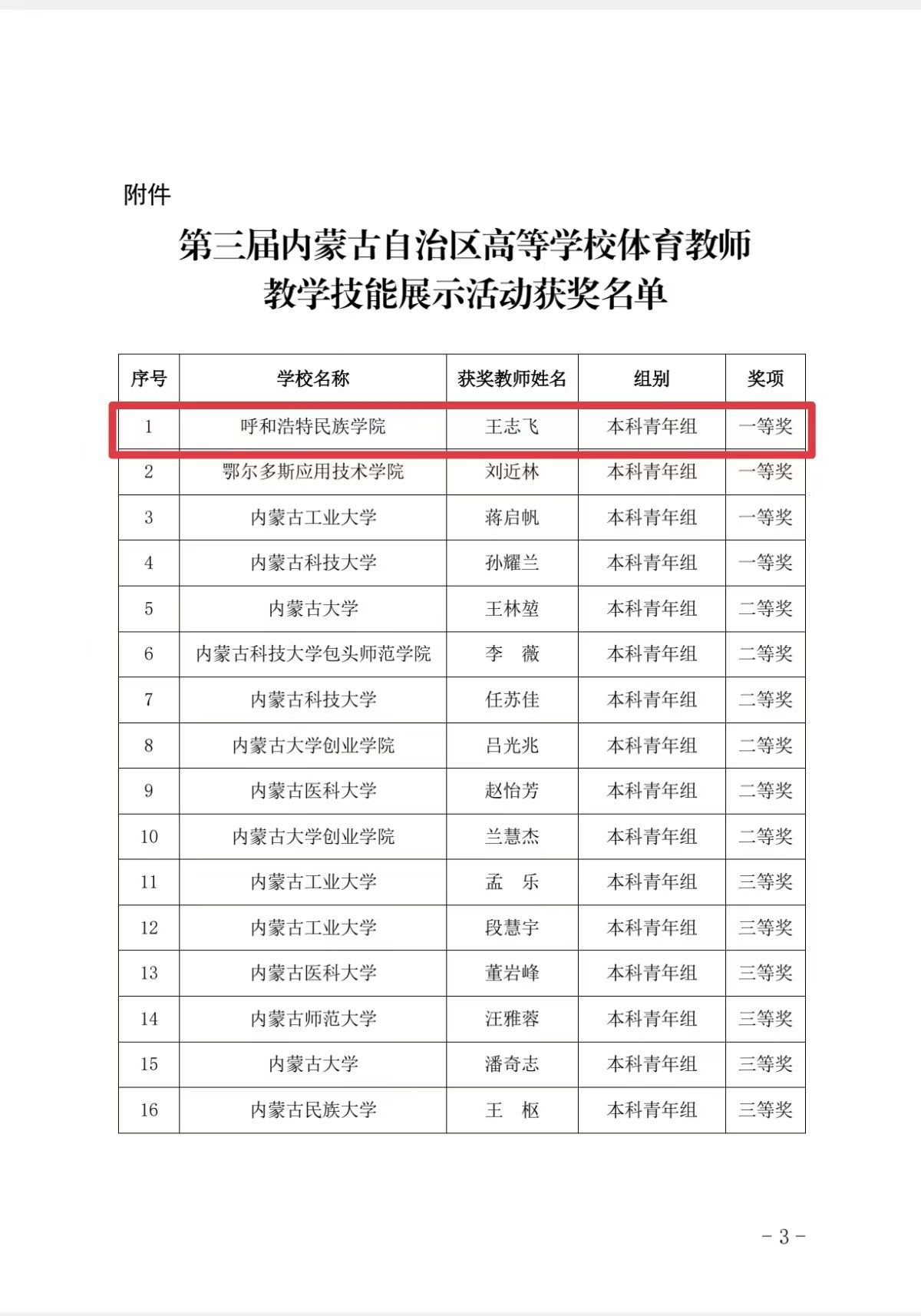 Beat365体育学院教师王志飞在自治区教育厅主办的第三届内蒙古自治区高等学校体育教师教学技能展示活动中荣获本科青年组第一名。该赛事由自治区教育厅组织区外 16 位全国高等学校体育教学指导委员会专家进行评审,经过网络评审和现场测试两个环节评选而出。