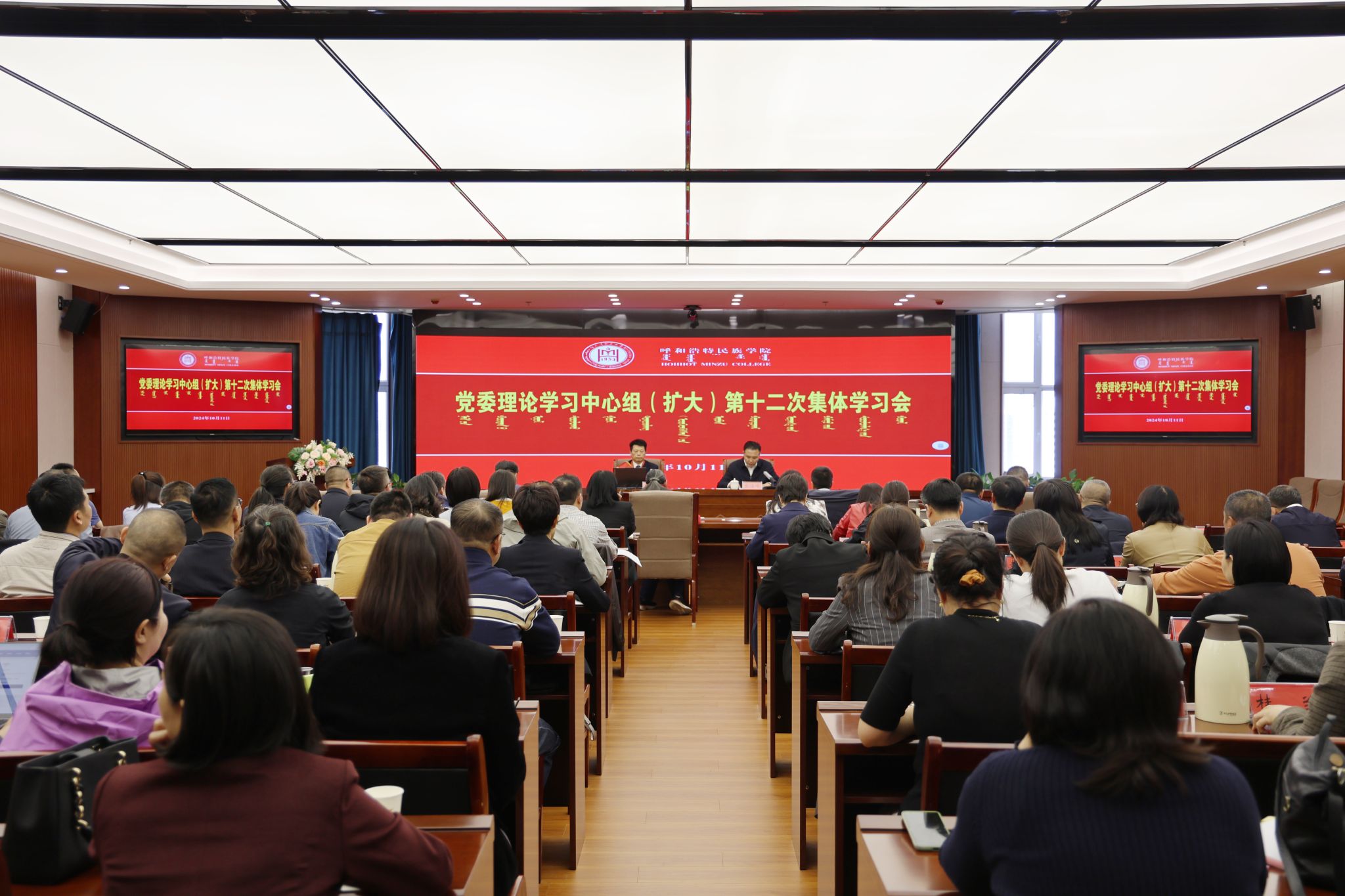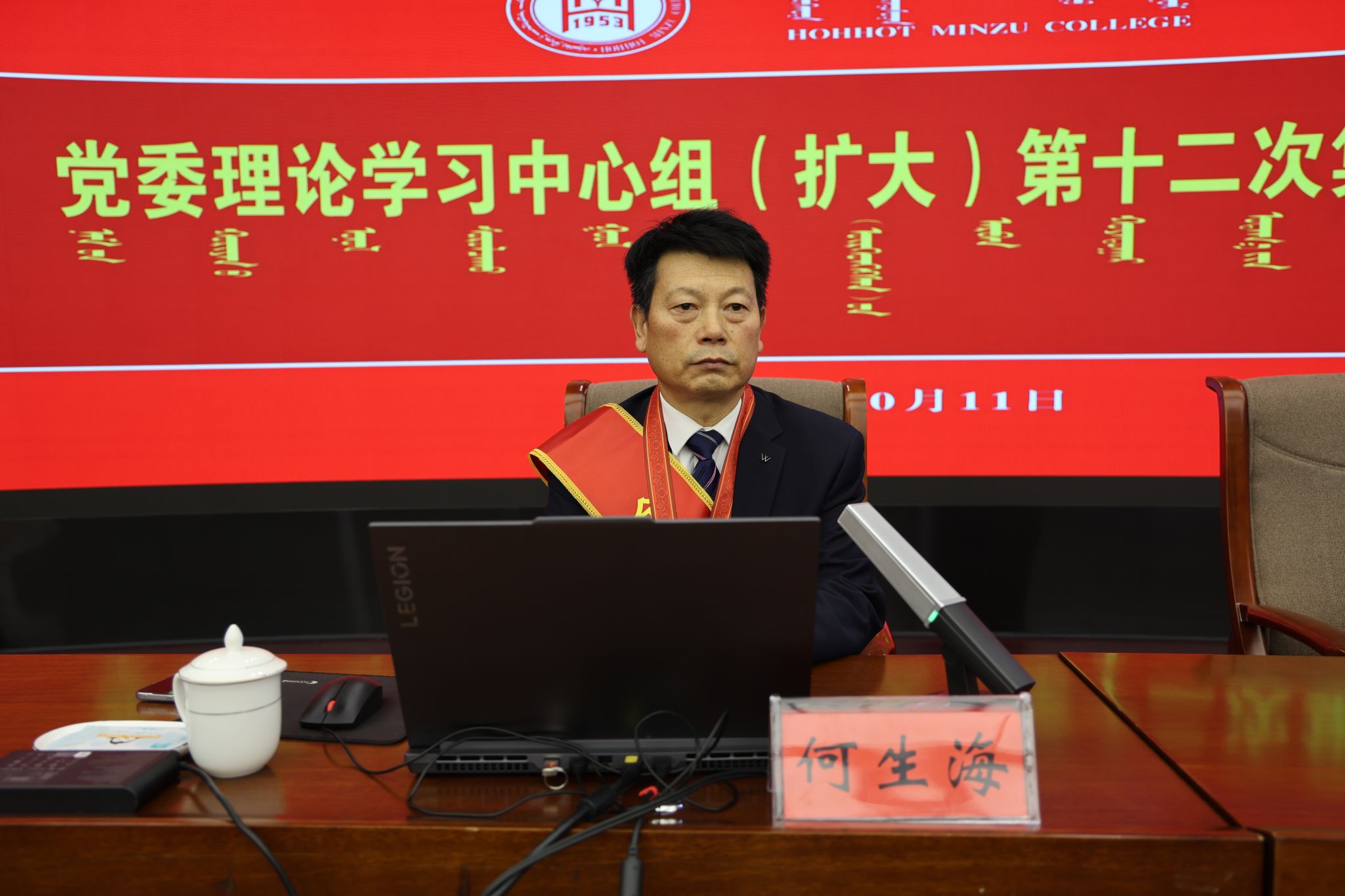 为进一步深入学习贯彻习近平总书记在全国民族团结进步表彰大会的重要讲话精神,扎实推进习近平总书记关于加强和改进民族工作的重要思想深入人心,贯彻落实党中央关于大力宣介中华民族共同体意识的重要要求,按照自治区民委铸牢中华民族共同体意识宣讲工作安排,10月11日,学校召开党委理论学习中心组(扩大)第十二次集体学习会,邀请全国民族团结进步模范个人、自治区民委铸牢中华民族共同体意识宣讲团成员、内蒙古大学特聘教授何生海作了专题宣讲。党委理论学习中心组成员、副处级以上干部、思政课教师代表以及学生代表参会。会议由校党委宣传部部长张海峰主持。